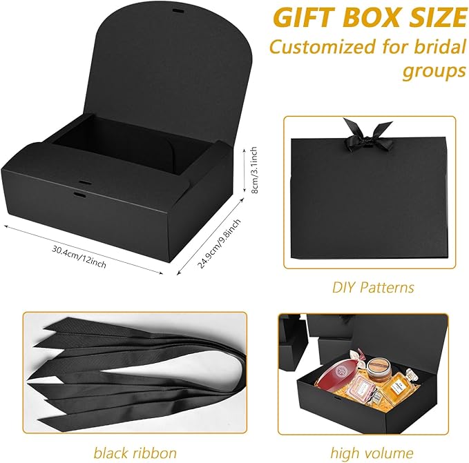 12Pack Black Gift Boxes with Lids, 12×9.8×3.1 Inch Groomsmen Proposal Box, Luxury Black Gift Box with Ribbon for Bridesmaid Box, Graduation, Christmas, Wedding, Birthday, Party