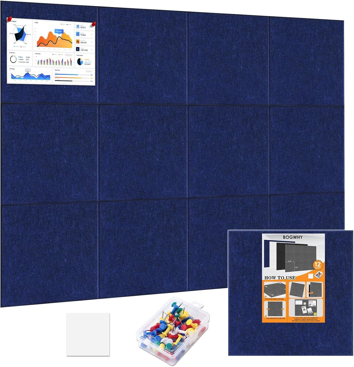 12-Pack Felt Cork Bulletin Board Set, Large Size 47''×35'', for Home (Deep Blue)