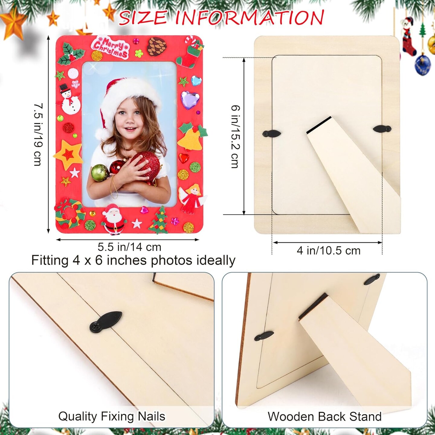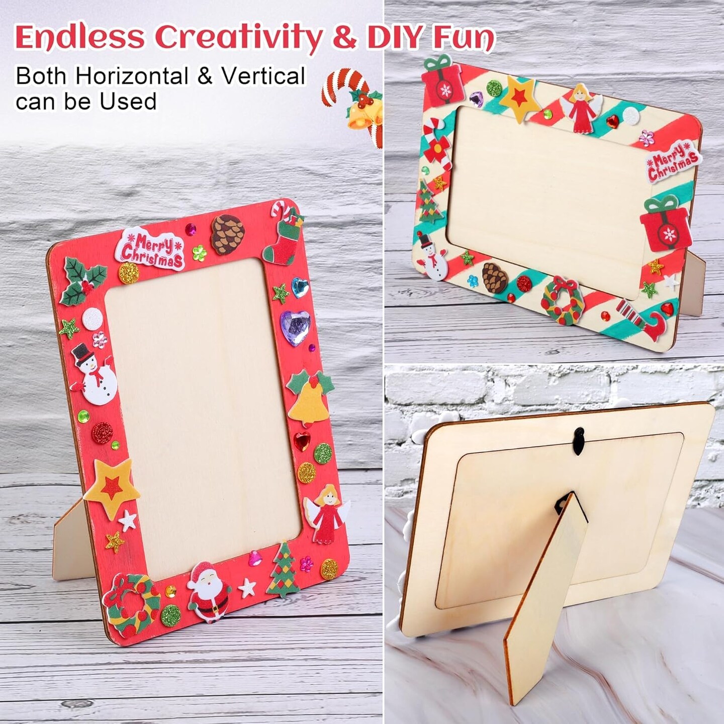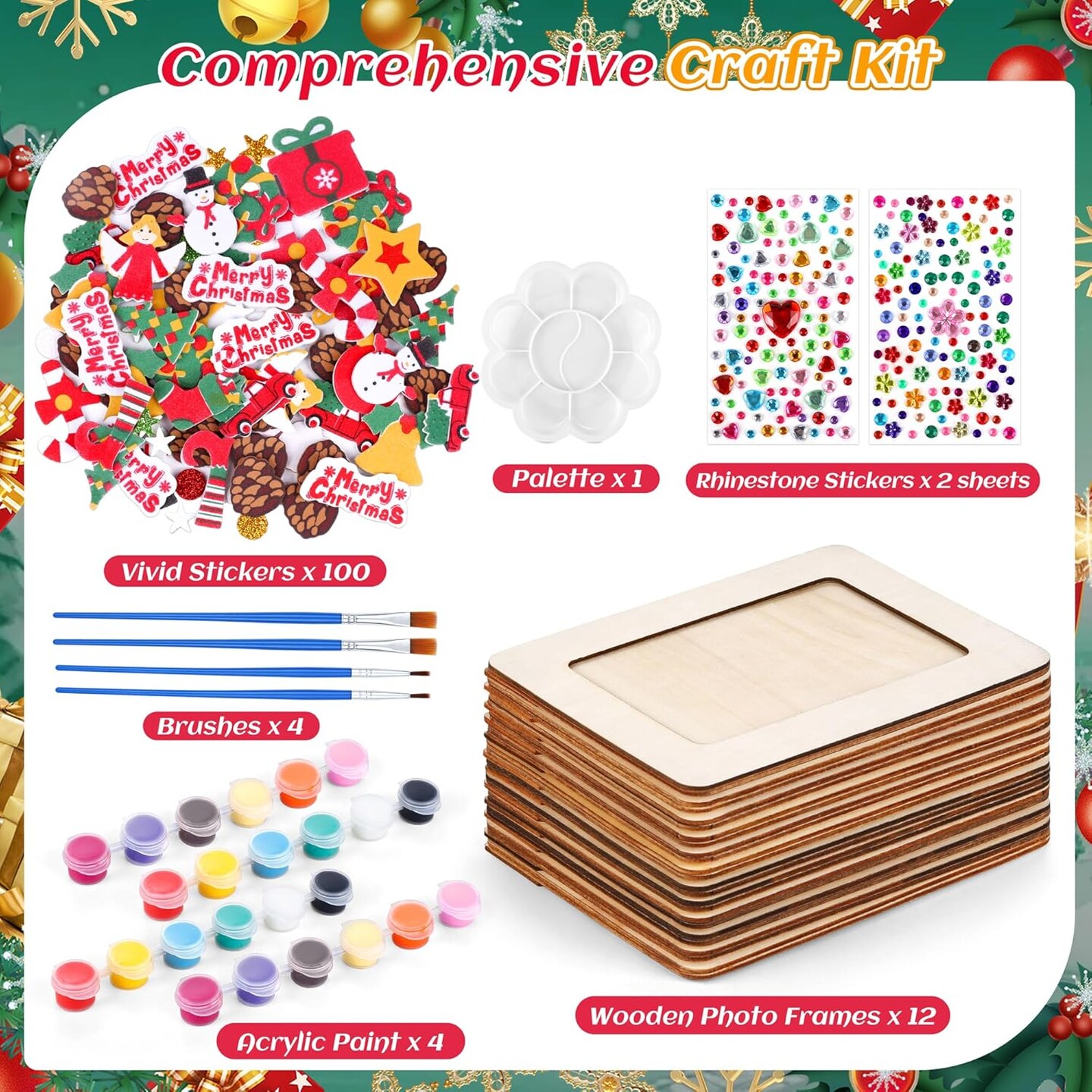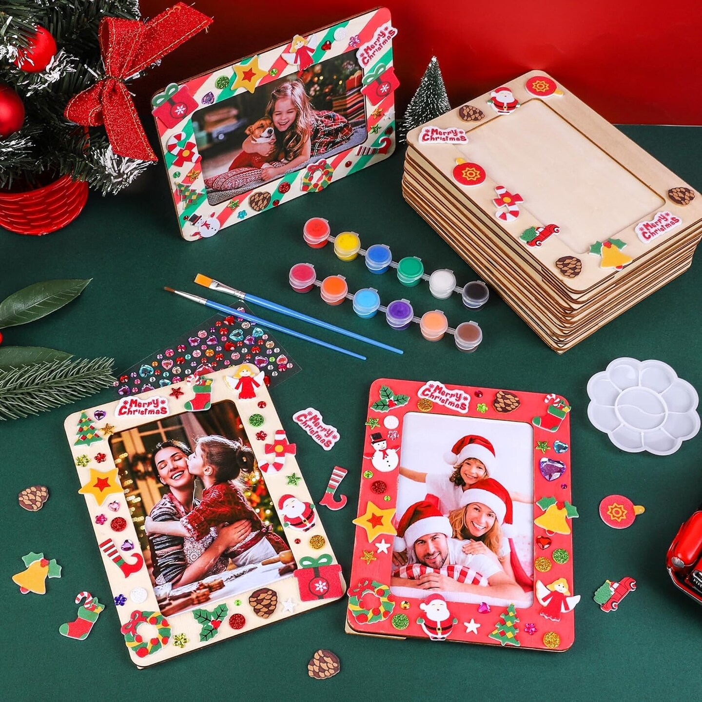 12-Pack Frozen Christmas DIY Picture Frame Craft Kit – Wooden 4x6” Frames with 100 Foam & Rhinestone Stickers, 4 Brushes, Paint Palette for Kids Holiday Crafts