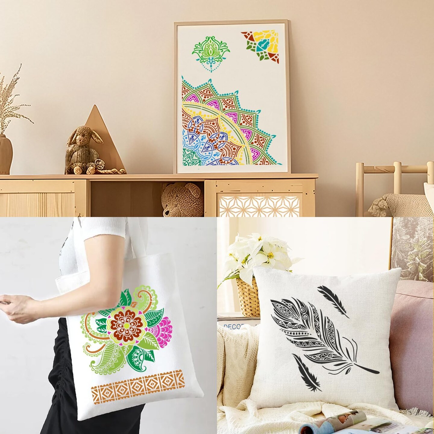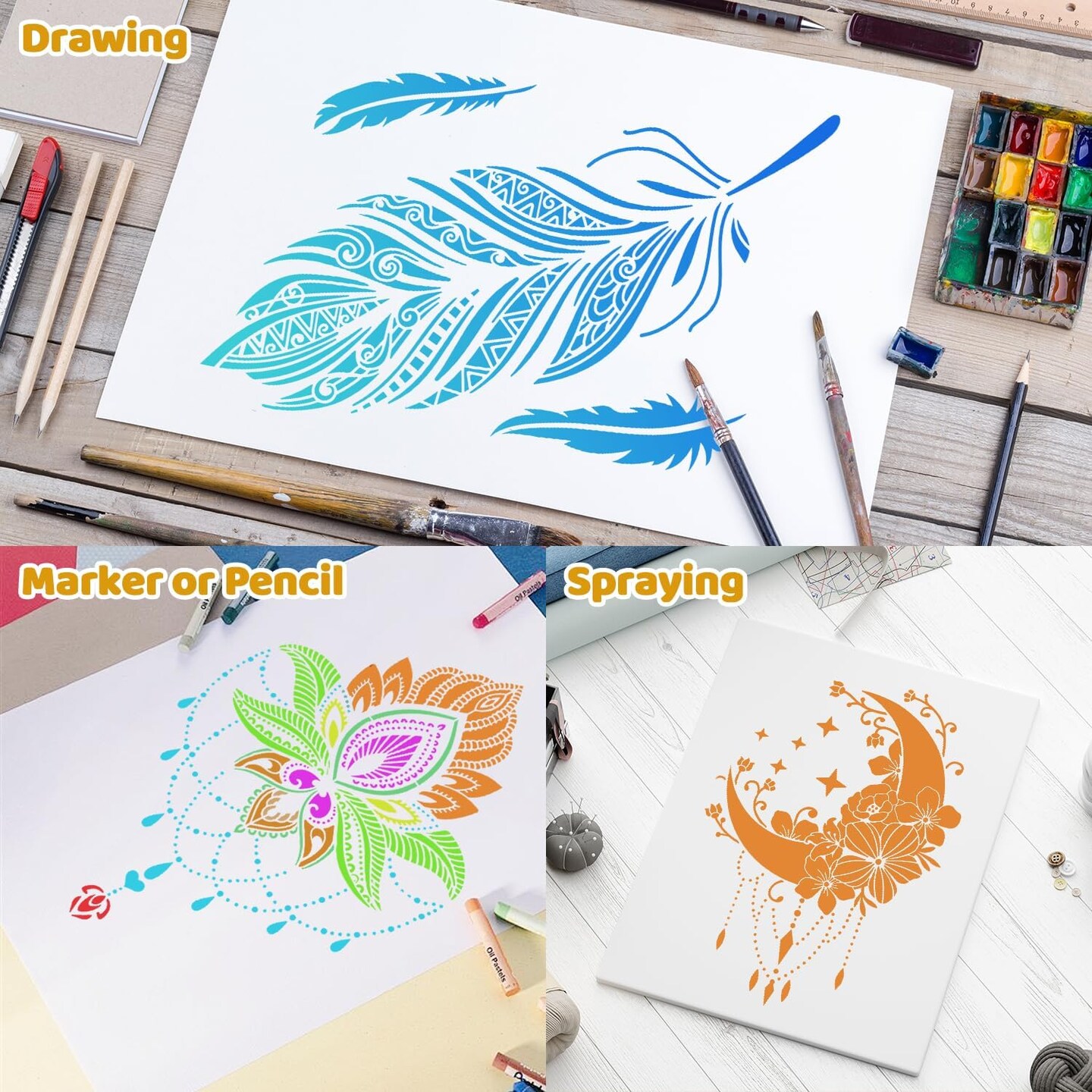 12-Pack Large Floral & Moon Mandala Stencils – Reusable A4 Painting Templates (8.3 x 11.7 in) for DIY Crafts on Walls, Floors, Wood, Tiles, Fabric & Furniture