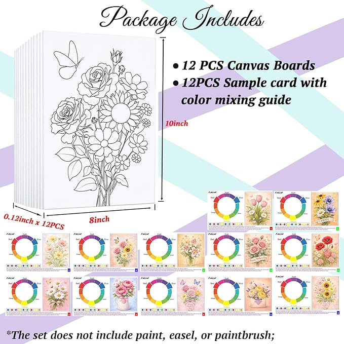 12Pcs 8x10 Pre Drawn Canvas for Painting for Adults Sip and Paint kit with Design Paint Party Favors Painting Supplies for Beginner Mother's Day Romance Canvases Art Board Set