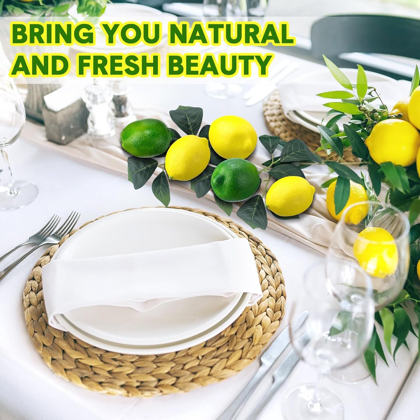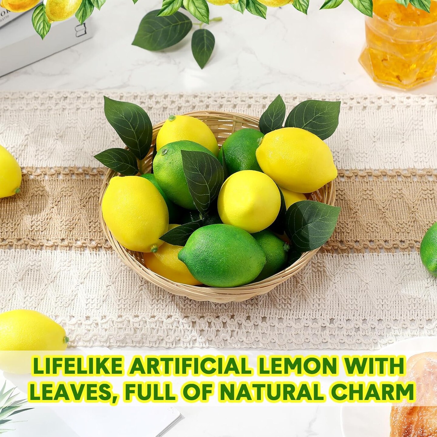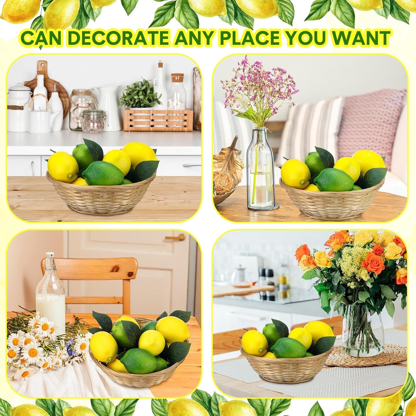 12PCS Artificial Lemon & Limes Set – Lifelike Faux Yellow & Green Fruits (3" x 2") with 10 Leaves and Woven Basket for Kitchen, Party, Table Décor, and Photography Props
