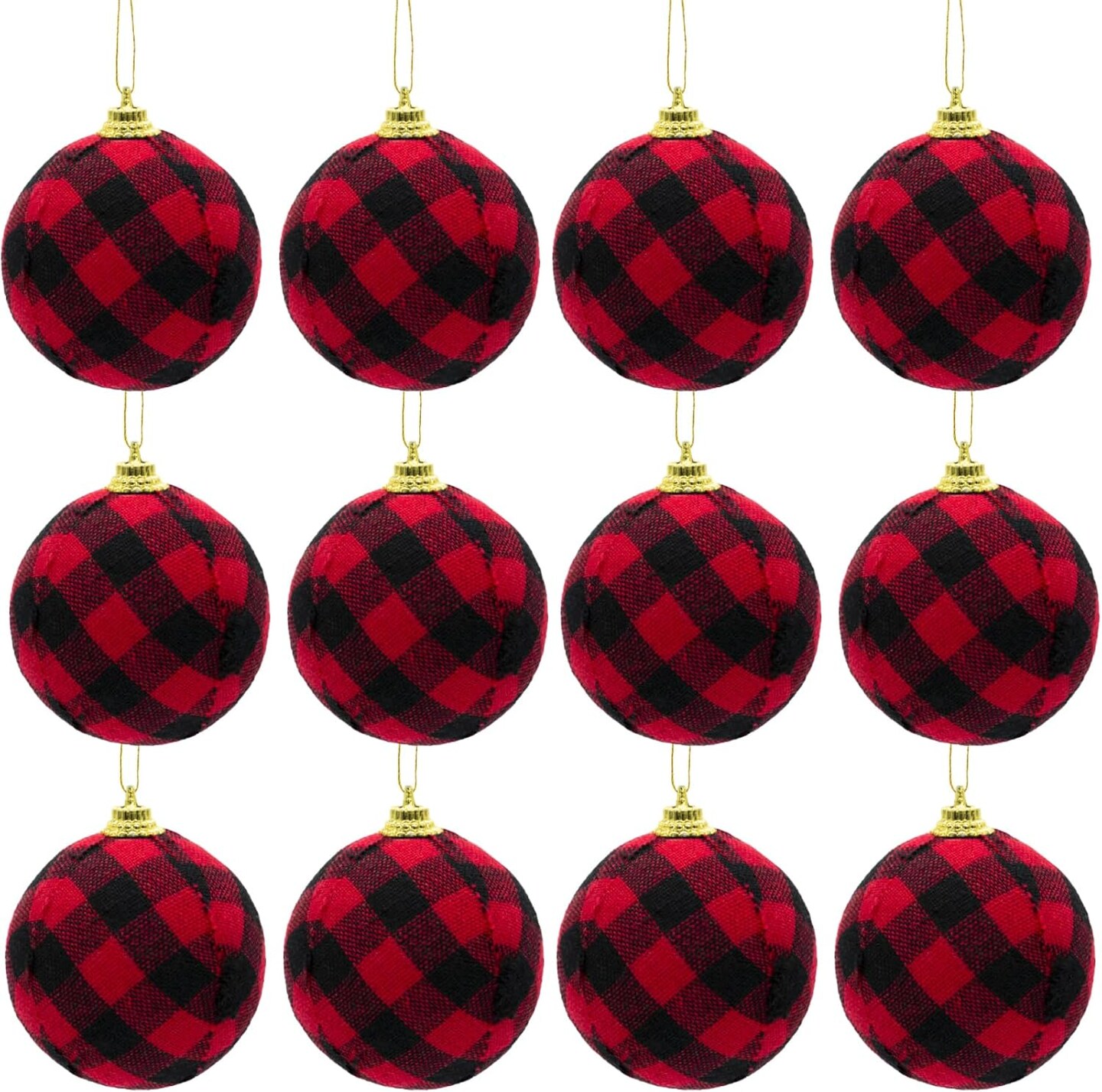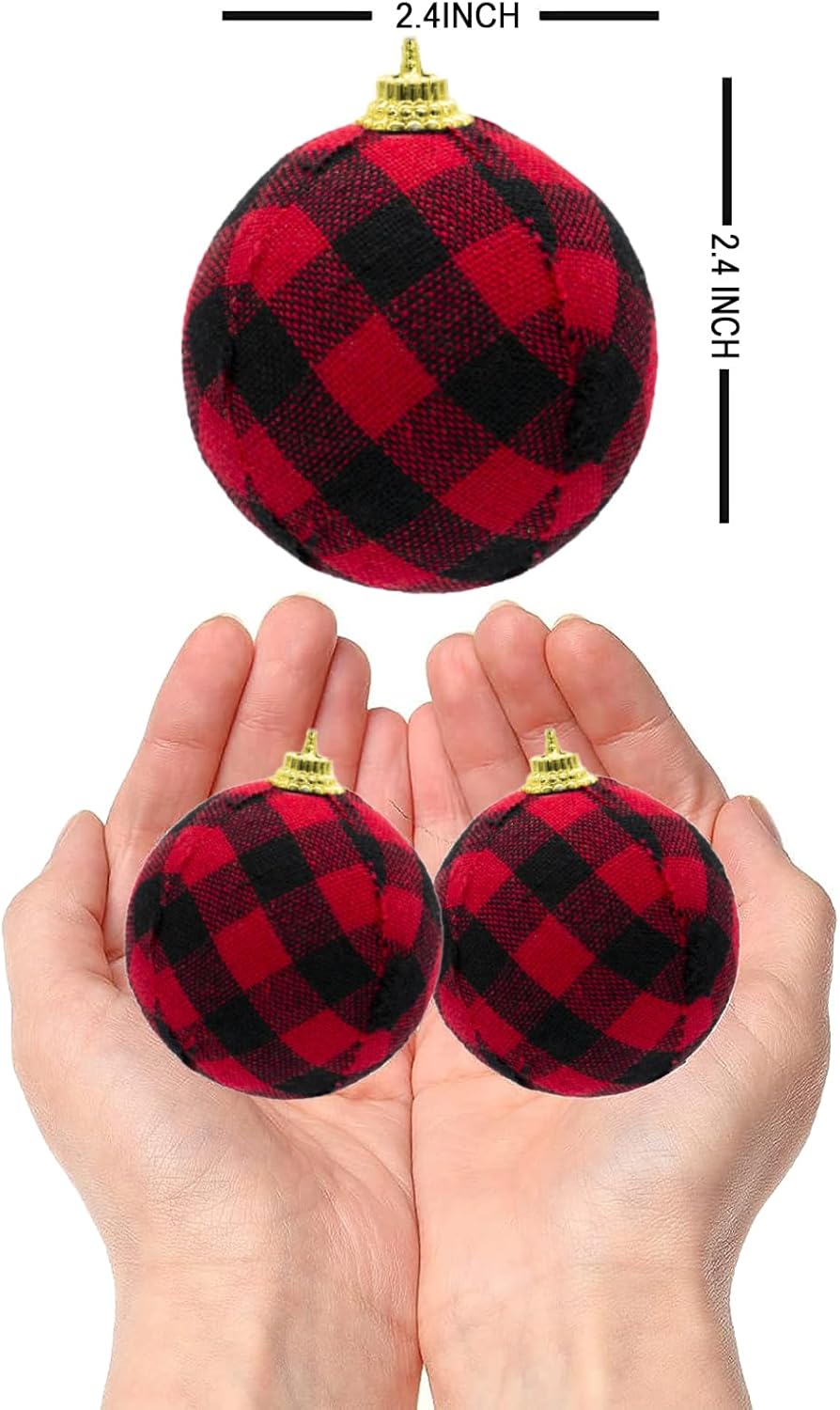 12pcs Christmas Ball Buffalo Plaid Fabric Christmas Balls 2.4"/60mm Hanging Ornaments Xmas Baubles Decorative Christmas Tree Hanging Ornaments for Party Holiday Decoration