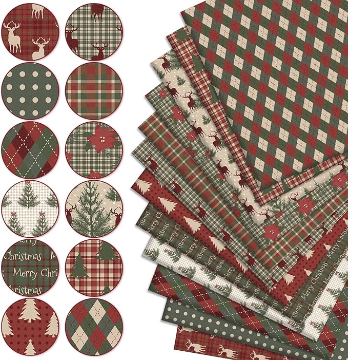 12Pcs Christmas Cotton Fabric Bundles Woodland Poinsettia Reindeer Tree Printed Fat Quarters Plaid Xmas Sewing Fabrics for DIY Handmade Crafting, 18 x 22 Inch