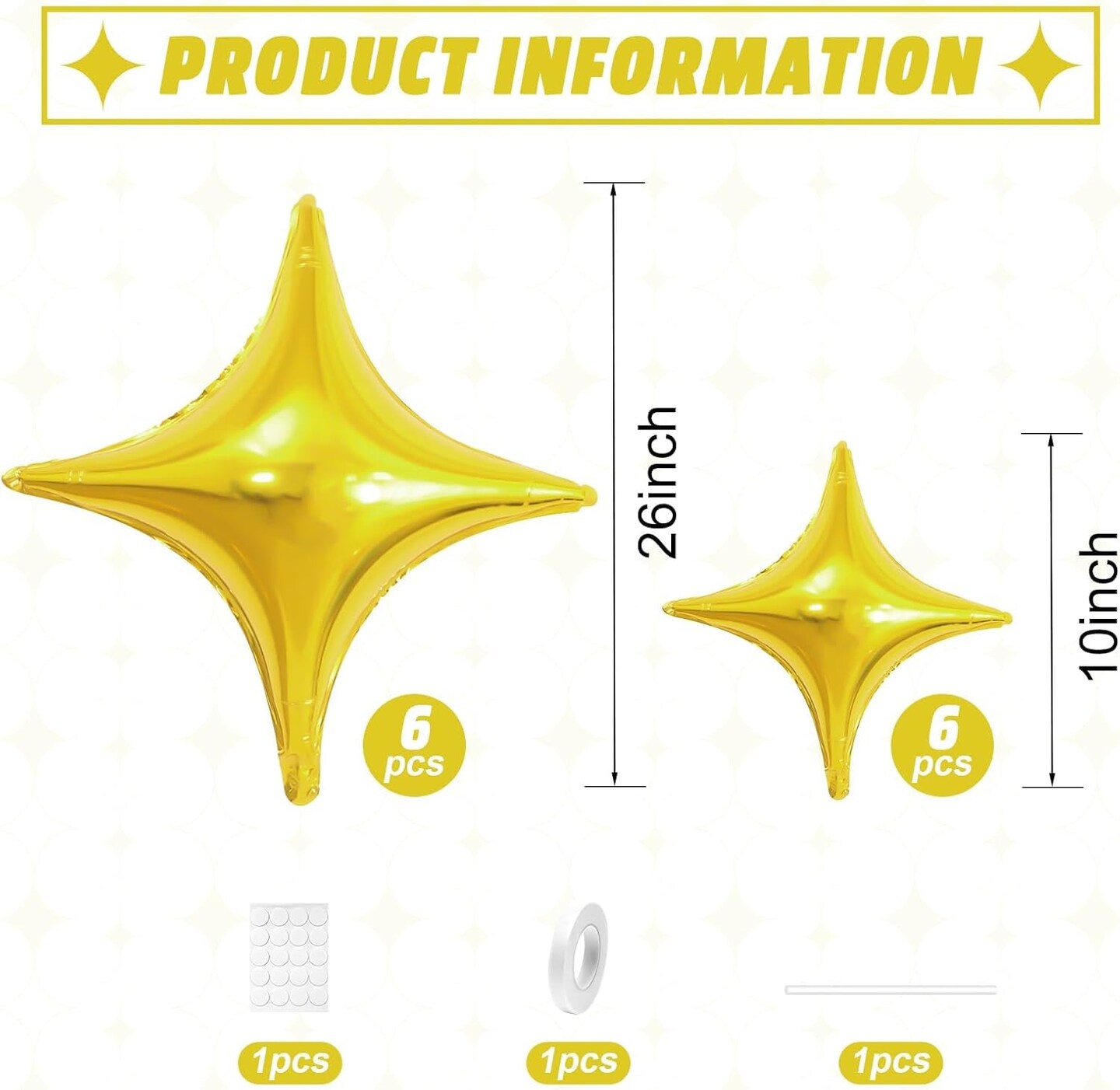 12PCS Gold Star Foil Balloons Set – 26 Inch & 10 Inch Four-Point Star Helium Balloons for Birthday, Graduation, Anniversary, Baby Shower, and Wedding Party Decorations