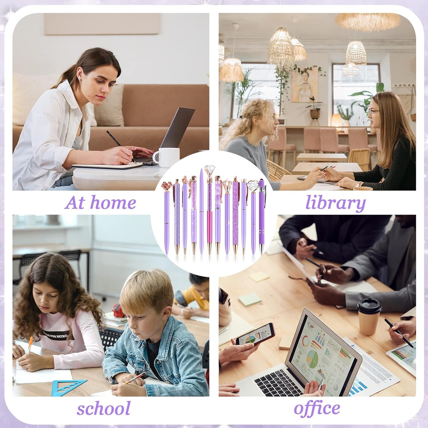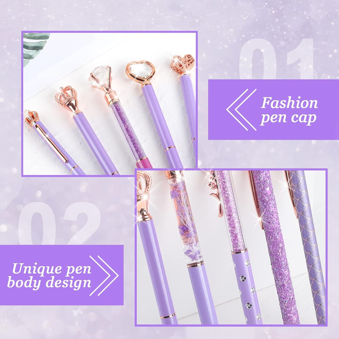 12Pcs Luxury Crystal Diamond Ballpoint Pens Set - Purple Glitter Metal Pens for Women, Journaling Supplies with Black Ink for School Office Desk