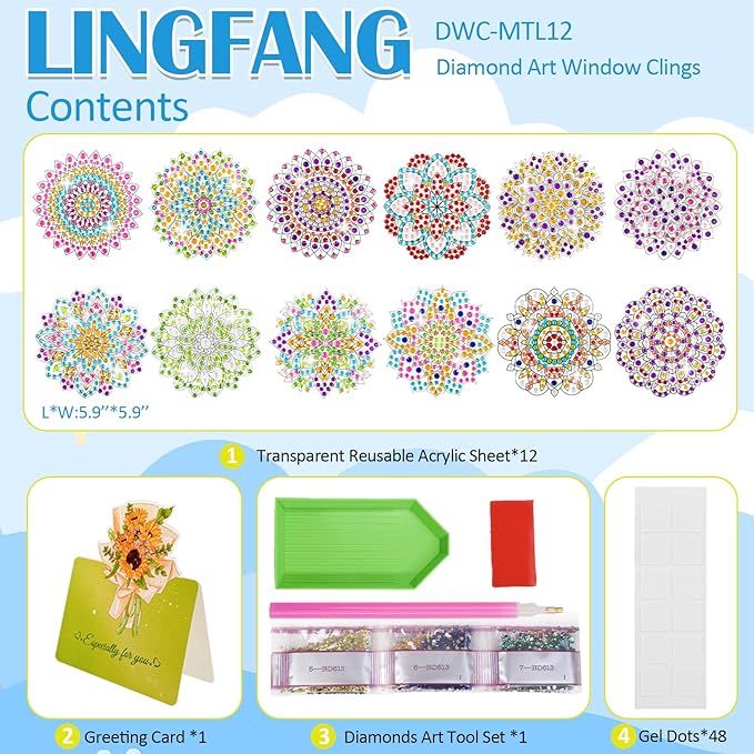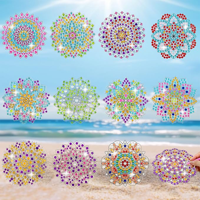 12-Piece Mandala Diamond Art Window Clings - 5D DIY Suncatcher Stickers for Glass - Stained Glass Effect Diamond Painting Kits for Adults & Beginners - Removable Gem Art Decals for Windows & Mirrors