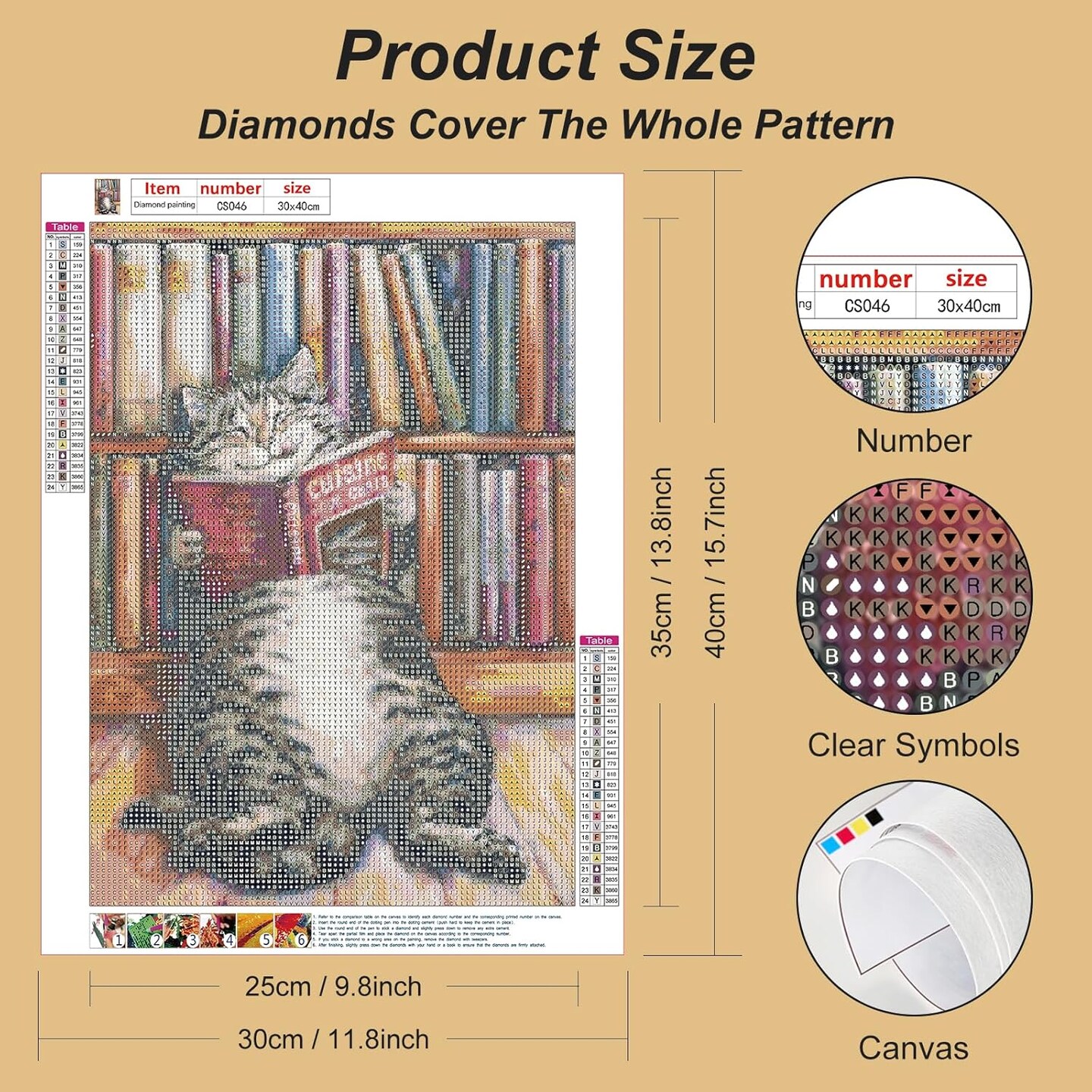 12x16 Inch Reading Cat Diamond Art Kit for Adults - DIY 5D Full Drill Diamond Painting for Beginners - Whimsical Cat Lover Gem Art & Diamond Dots for Home Wall Decor (Unframed)