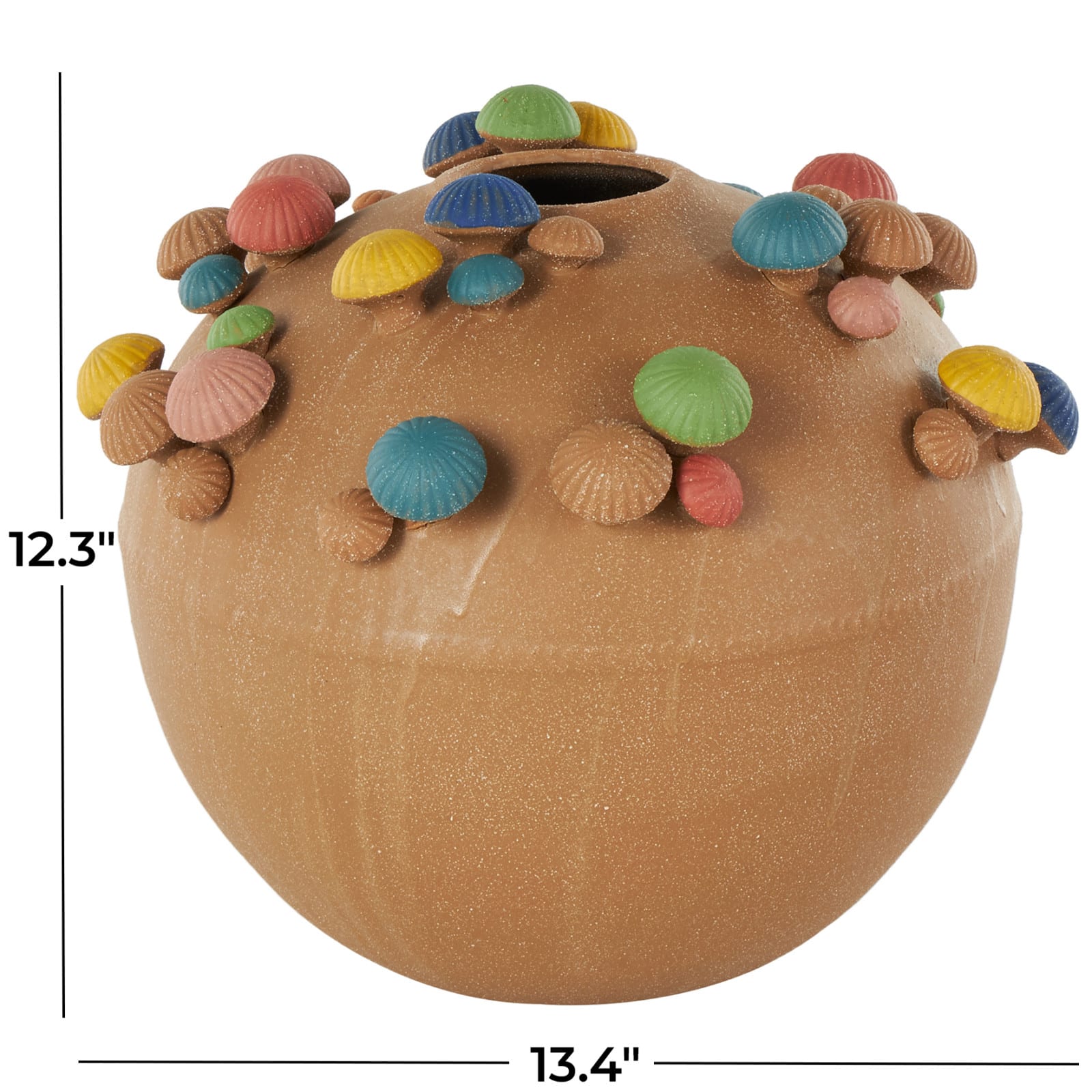 13" Brown Ceramic Round Wide Decorative Vase with Multicolor Mushroom Accents