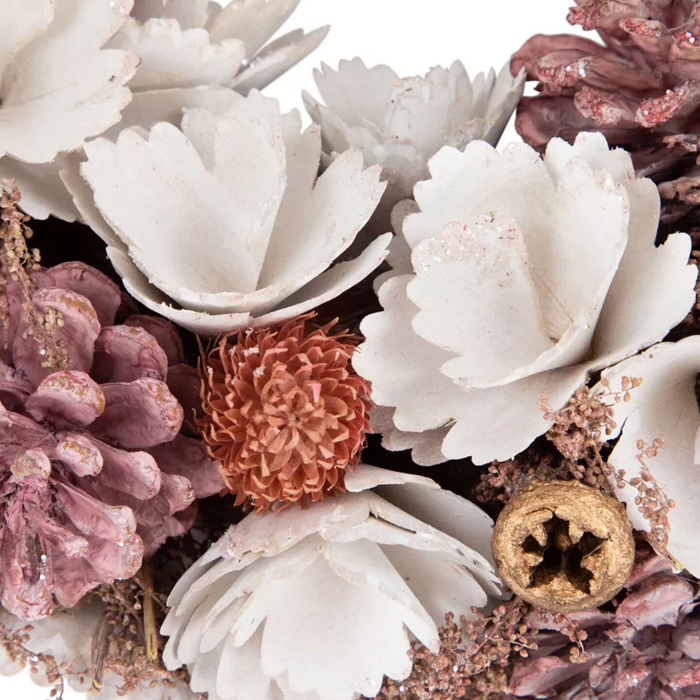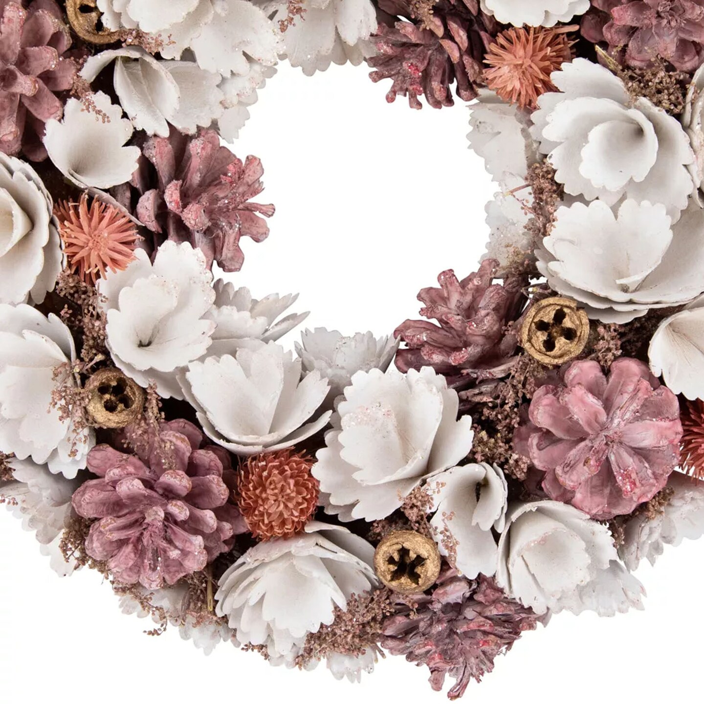 13" White and Pink Floral Christmas Wreath with Wooden Accents and Pinecones