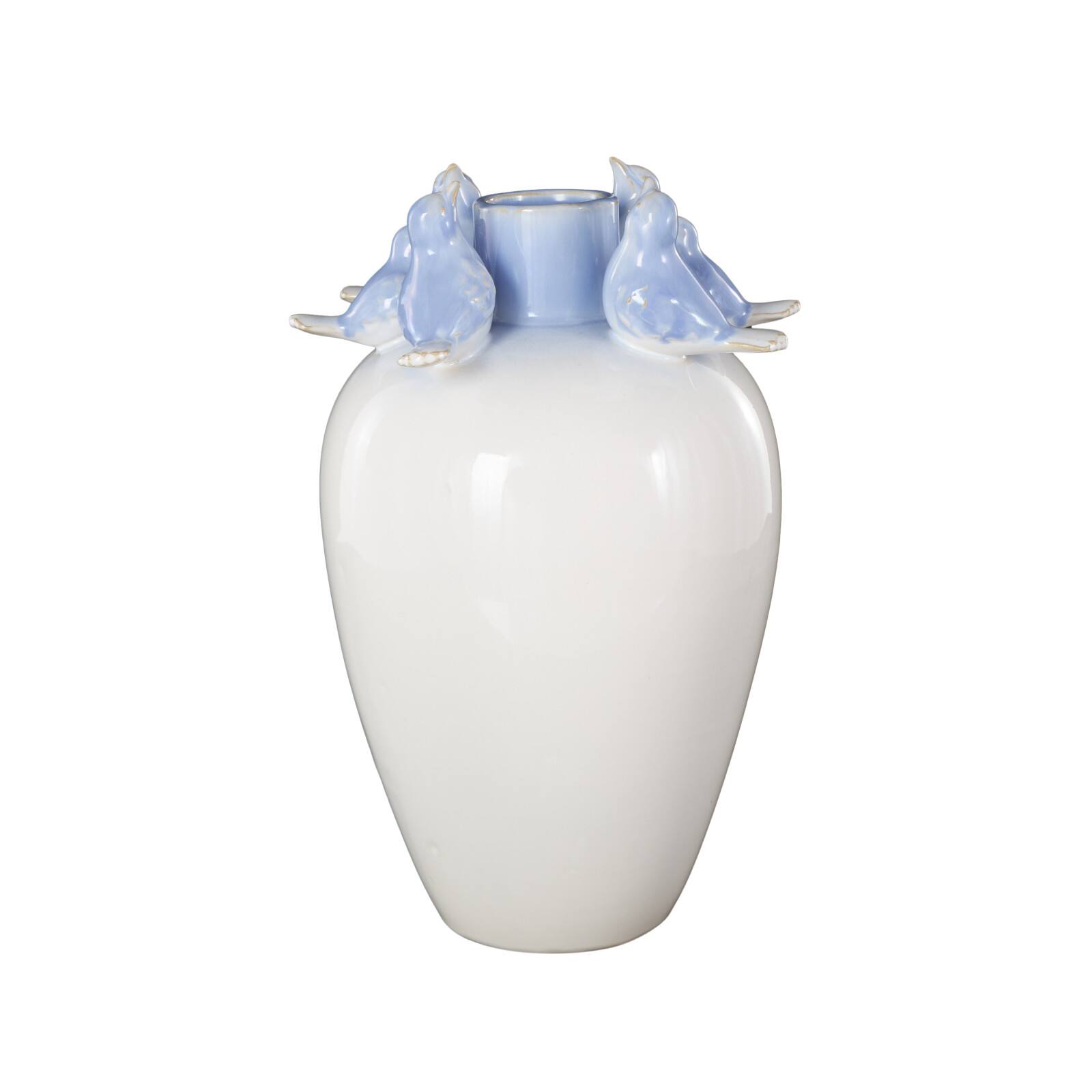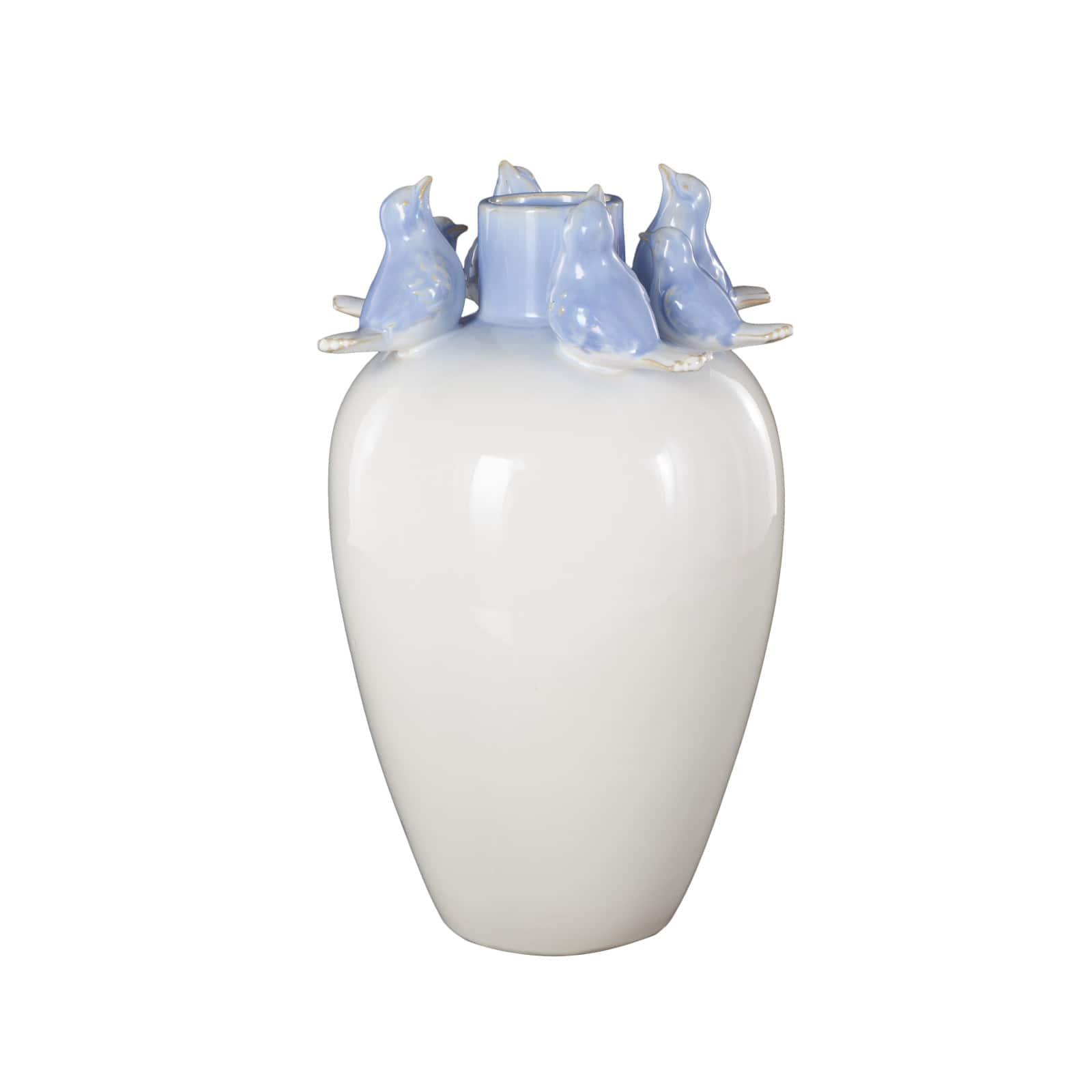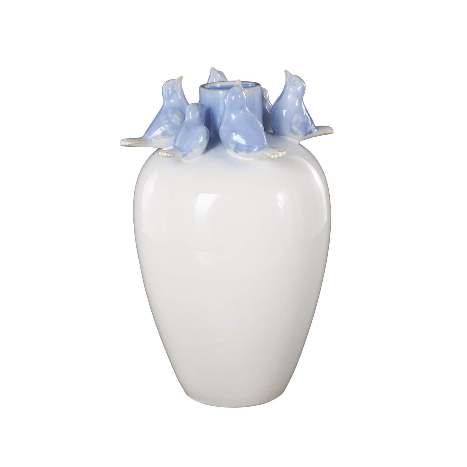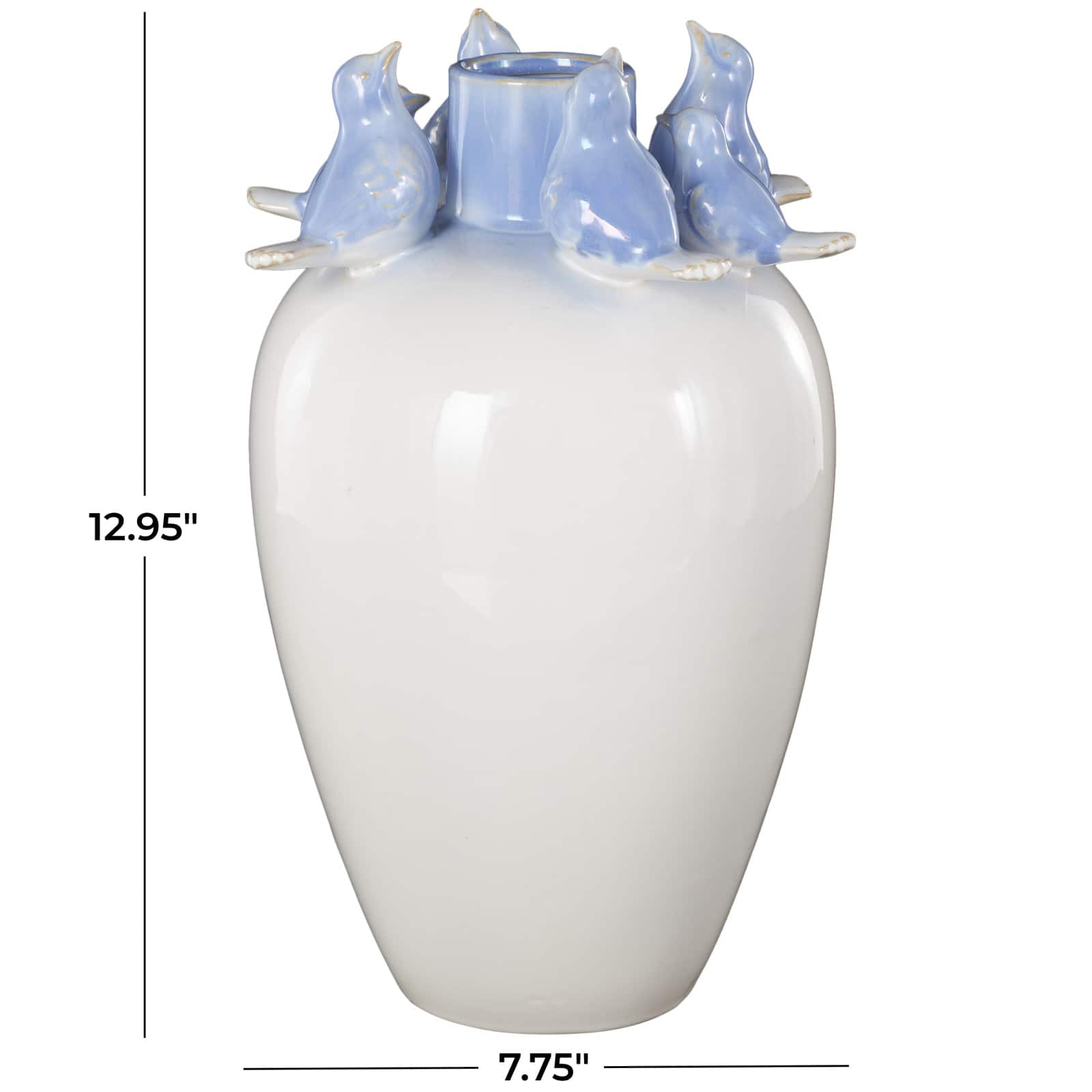 13" White Ceramic Bird Decorative Vase with Blue Accents
