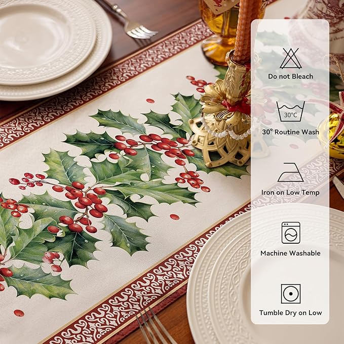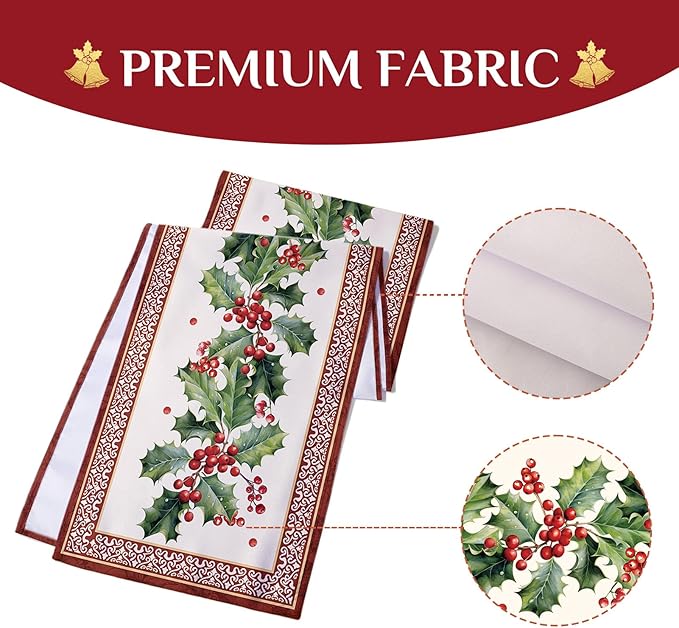 13 x 72 Inch, Printed Holly Christmas Satin Runners,Seasonal Winter Holiday Decoration for Kitchen, Dining Table, and Home Party Decor