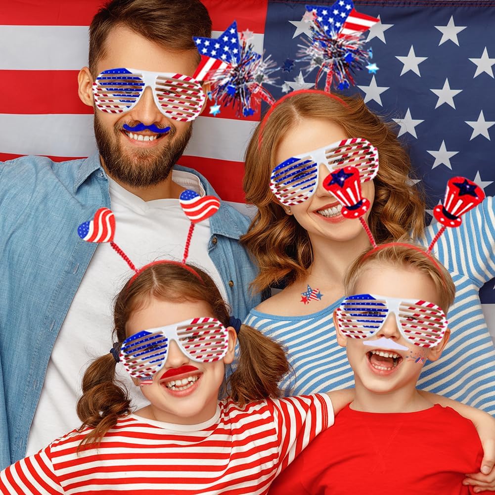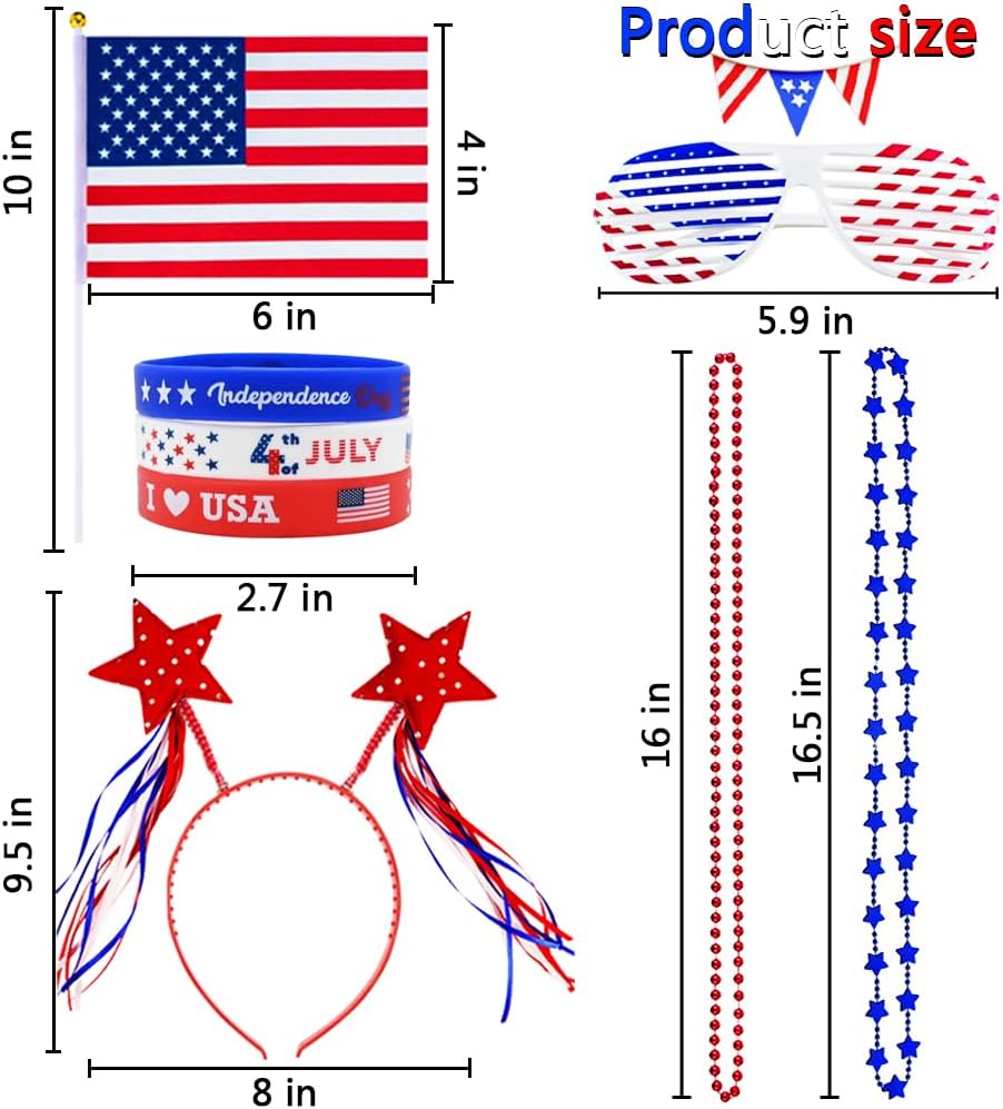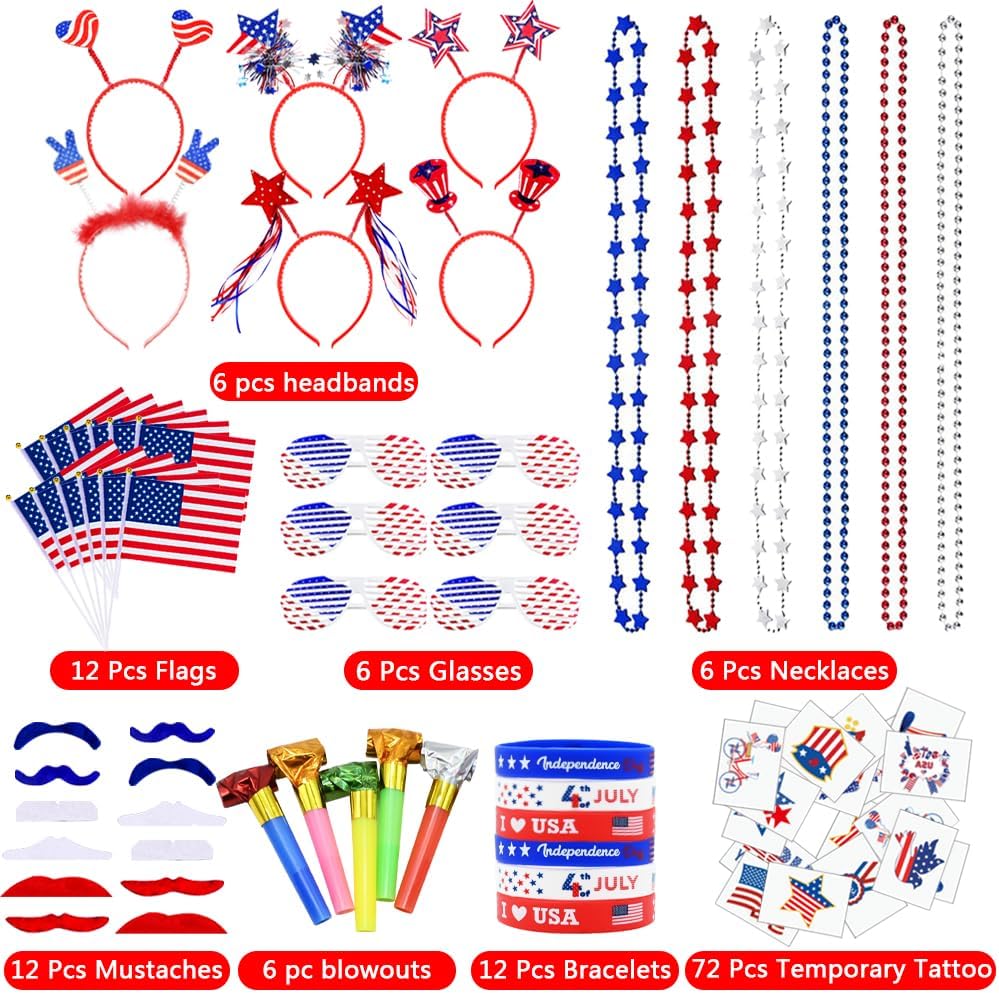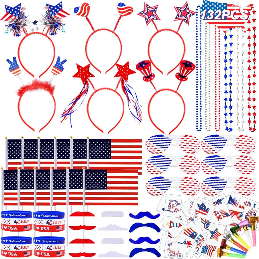 132 Pcs Patriotic Party Favors, 4th of July Accessories Include Headbands Glasses Necklaces Flags Bracelets
