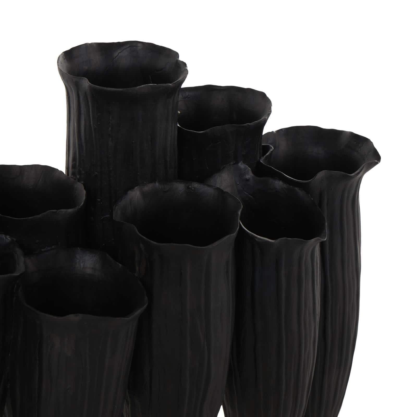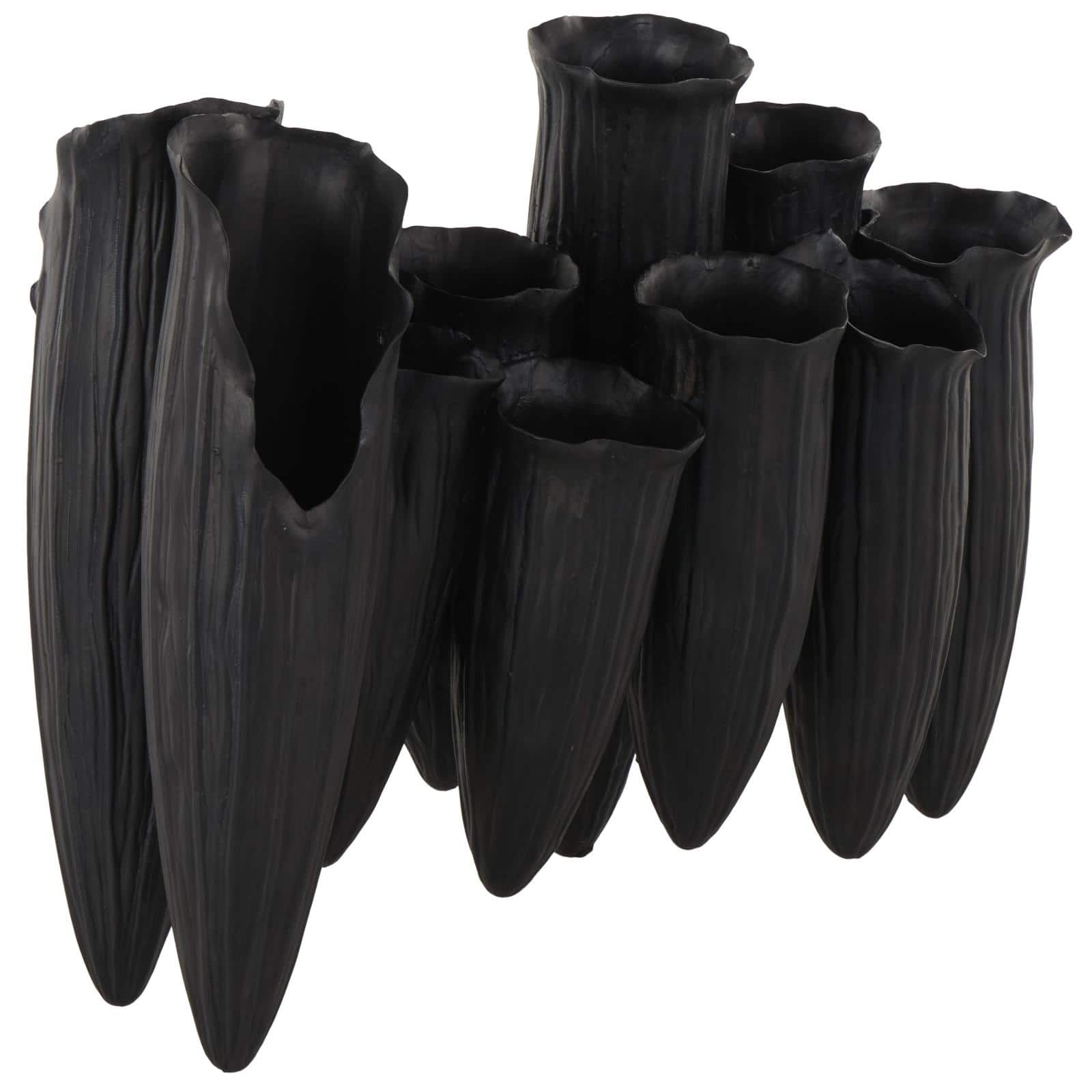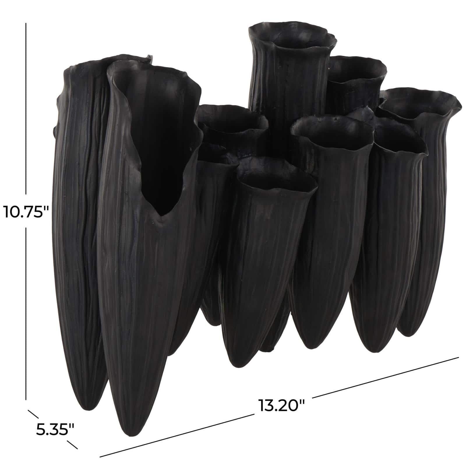 13.25" Black Ceramic Abstract Floral Inspired Decorative Vase with Linear Grooves & 10 Openings