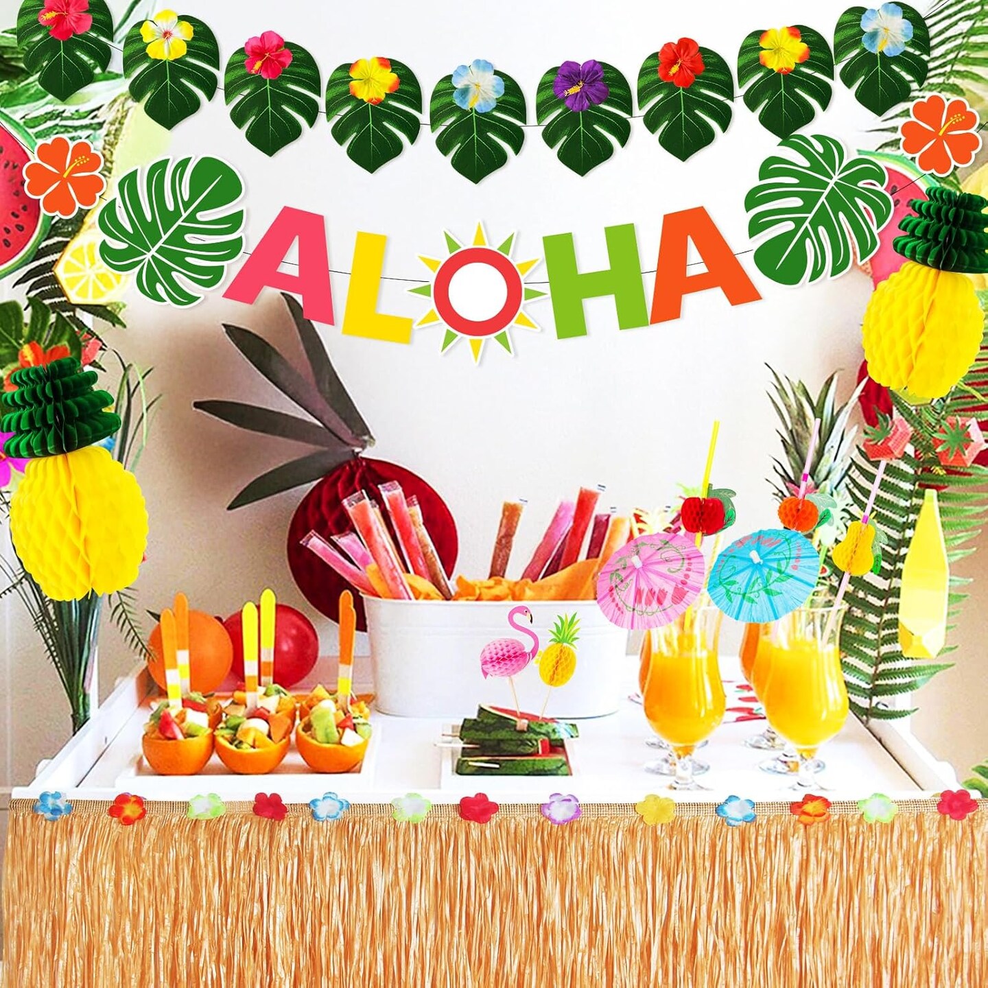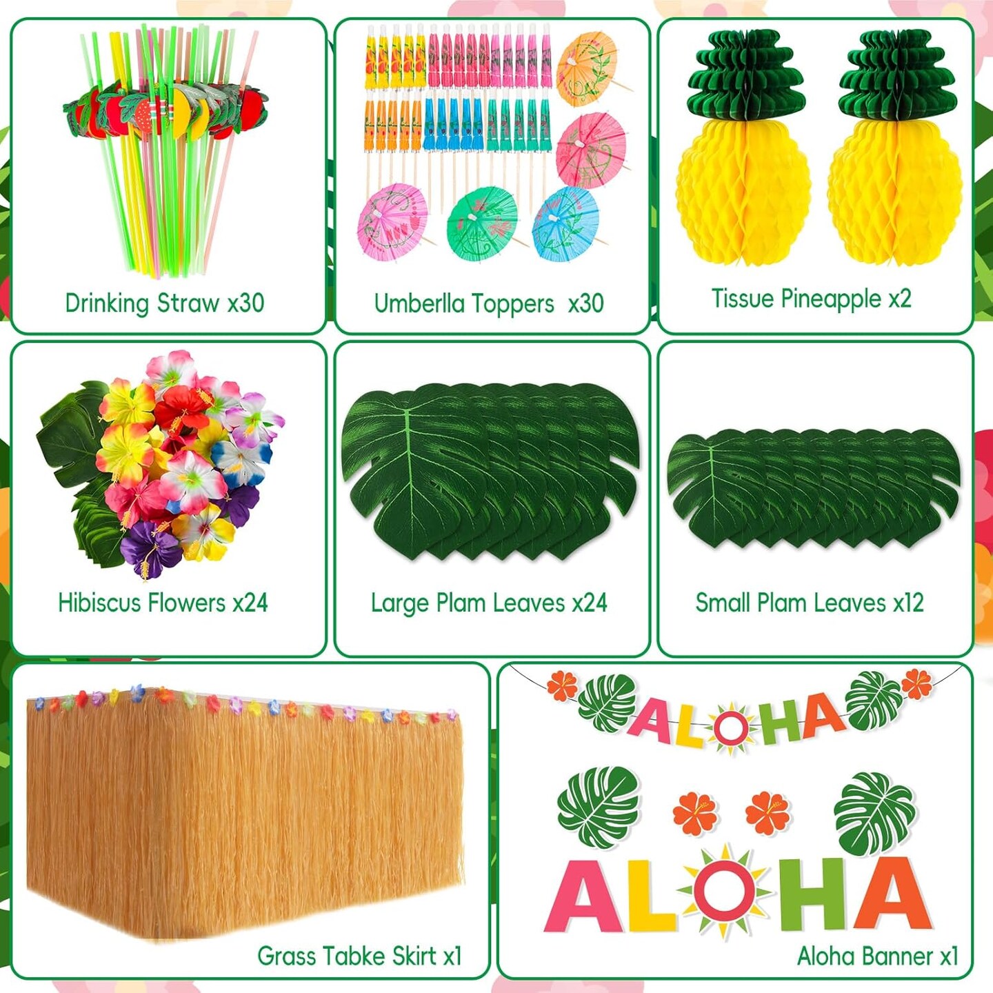 135 Pcs Luau Party Decoration Set Hawaiian Tropical Including 9 feet Hawaiian Luau Grass Table Skirt, Hawaiian Flowers, Palm Leaves, Multicolored Umbrellas, Paper Pineapple, Pineapple Décors