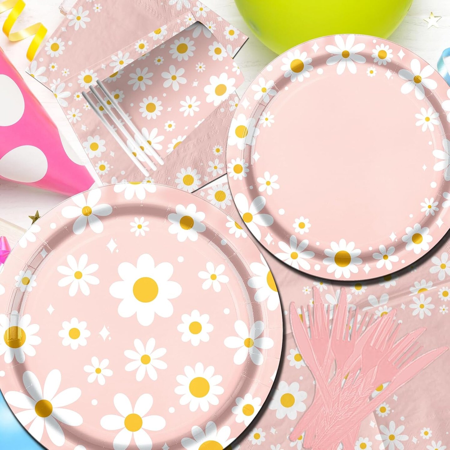 142PCS Daisy Birthday Party Tableware Set,Pink Groovy Daisy Flower Supplies Include Daisy Plates and Napkins Cup Tablecloth Banner for Retro Theme Hippie Girl Birthday Baby Shower Wedding Supplies