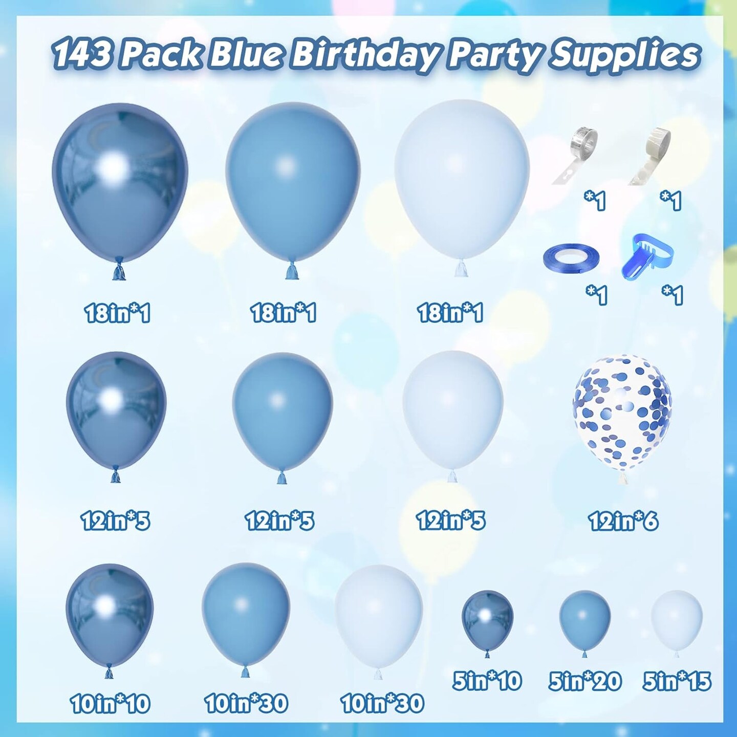 143Pcs Blue Balloons Arch Garland Kit, Different Size Metallic Blue Macaron Confetti Balloons for Boys Blue Birthday Baby Shower Wedding Ocean Themed Party Background Decorations Supplies