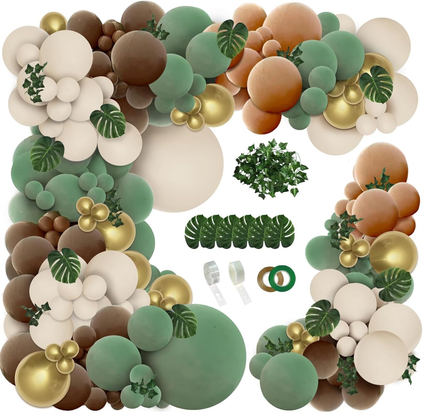 148pcs Woodland Safari Jungle Wild One Balloon Garland Arch Kit Sage Green and Brown Sand white Balloons with Palm Leaves for Tropical Boho Birthday Party Supplies Baby Shower Decorations