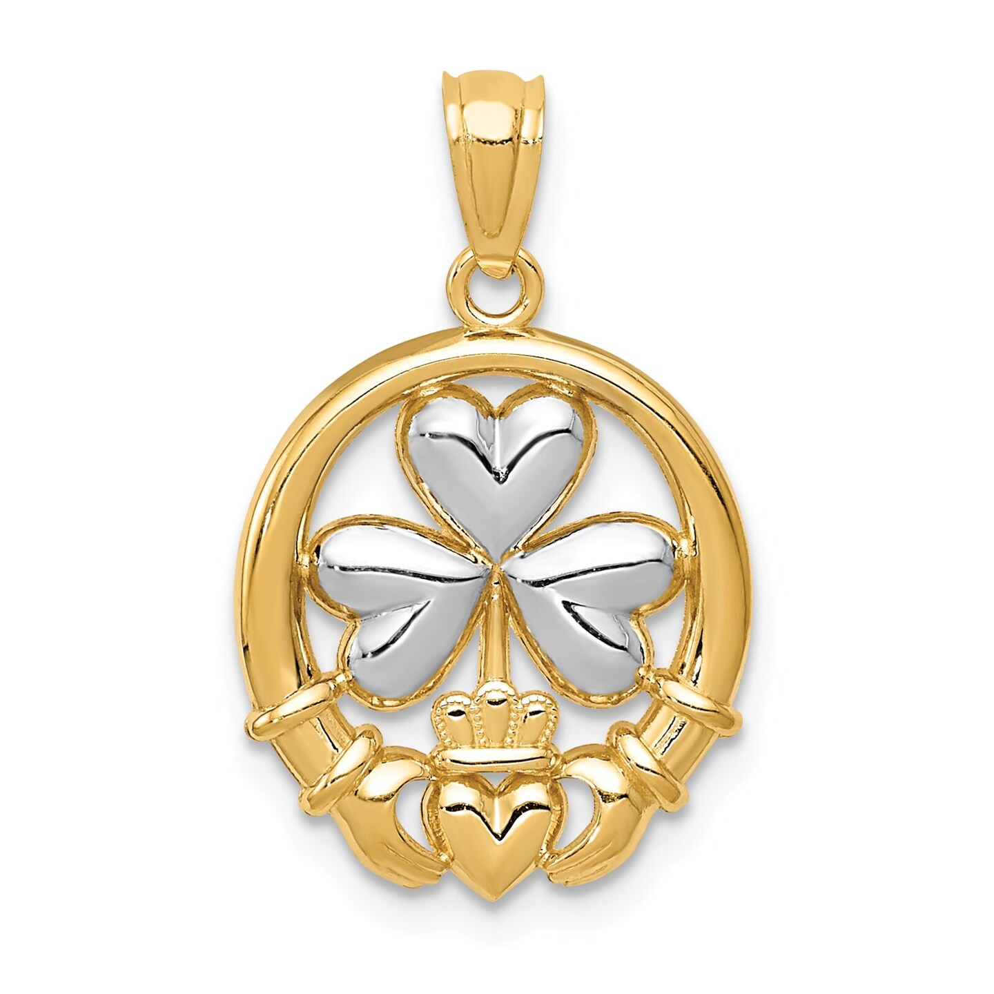 14K Two Tone Gold Claddagh & Shamrock Charm Pendant Jewerly 24mm x 15.5mm