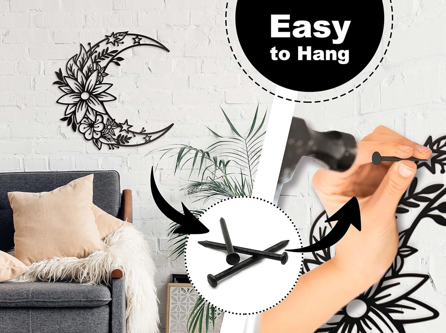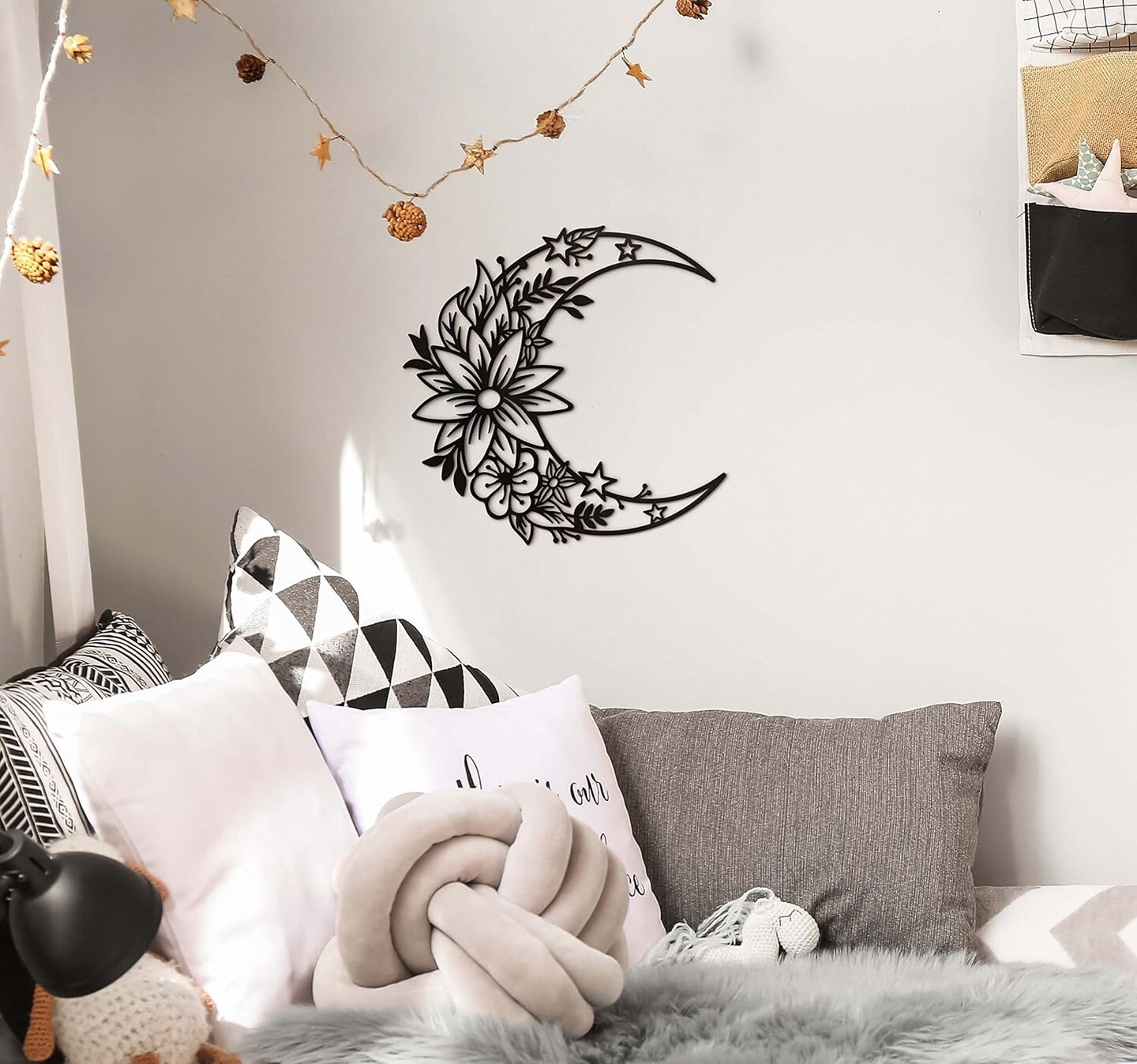 14"X13.5" Black Boho Large Floral Moon and Star Phase Wall signs