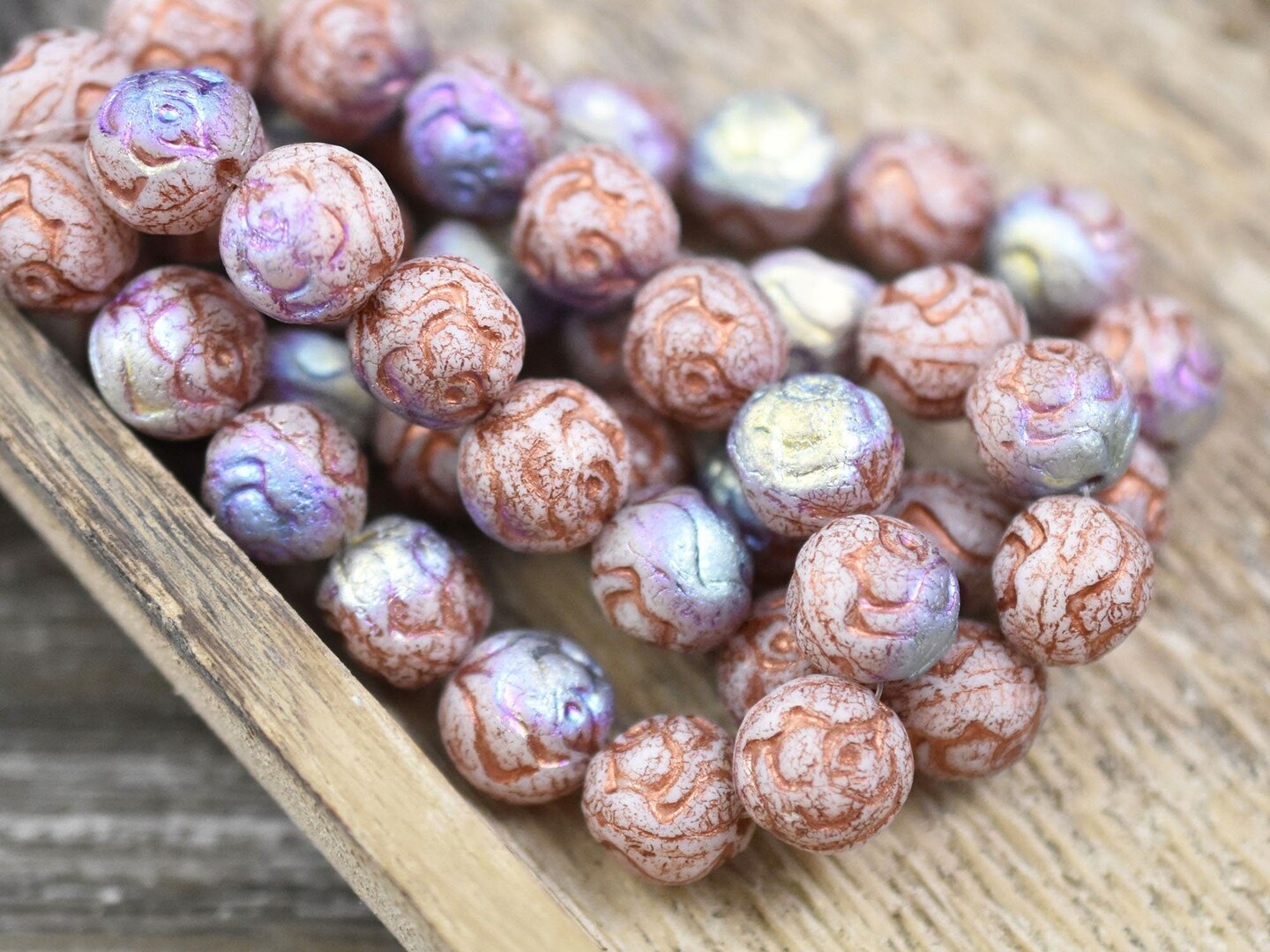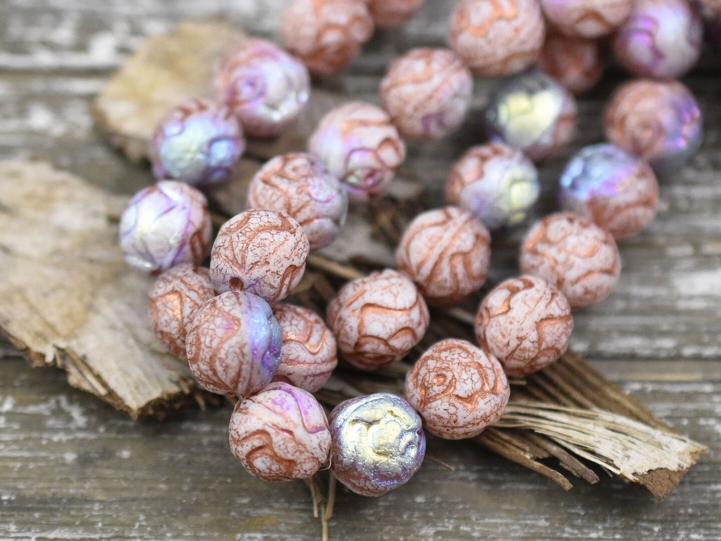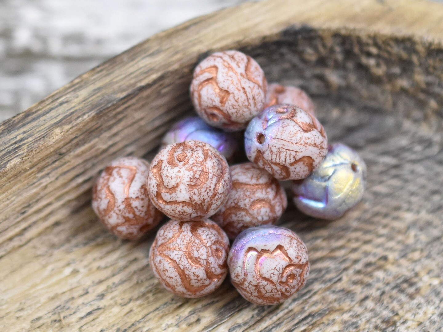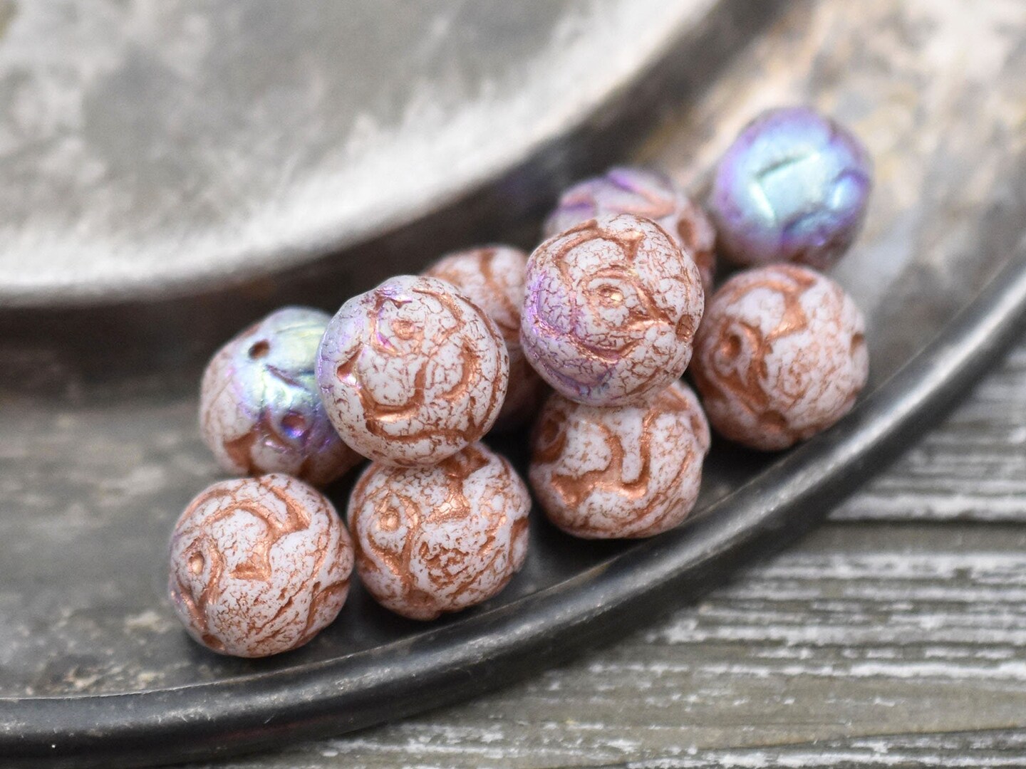 *15* 10mm Copper Washed Etched White AB Round Rose Beads