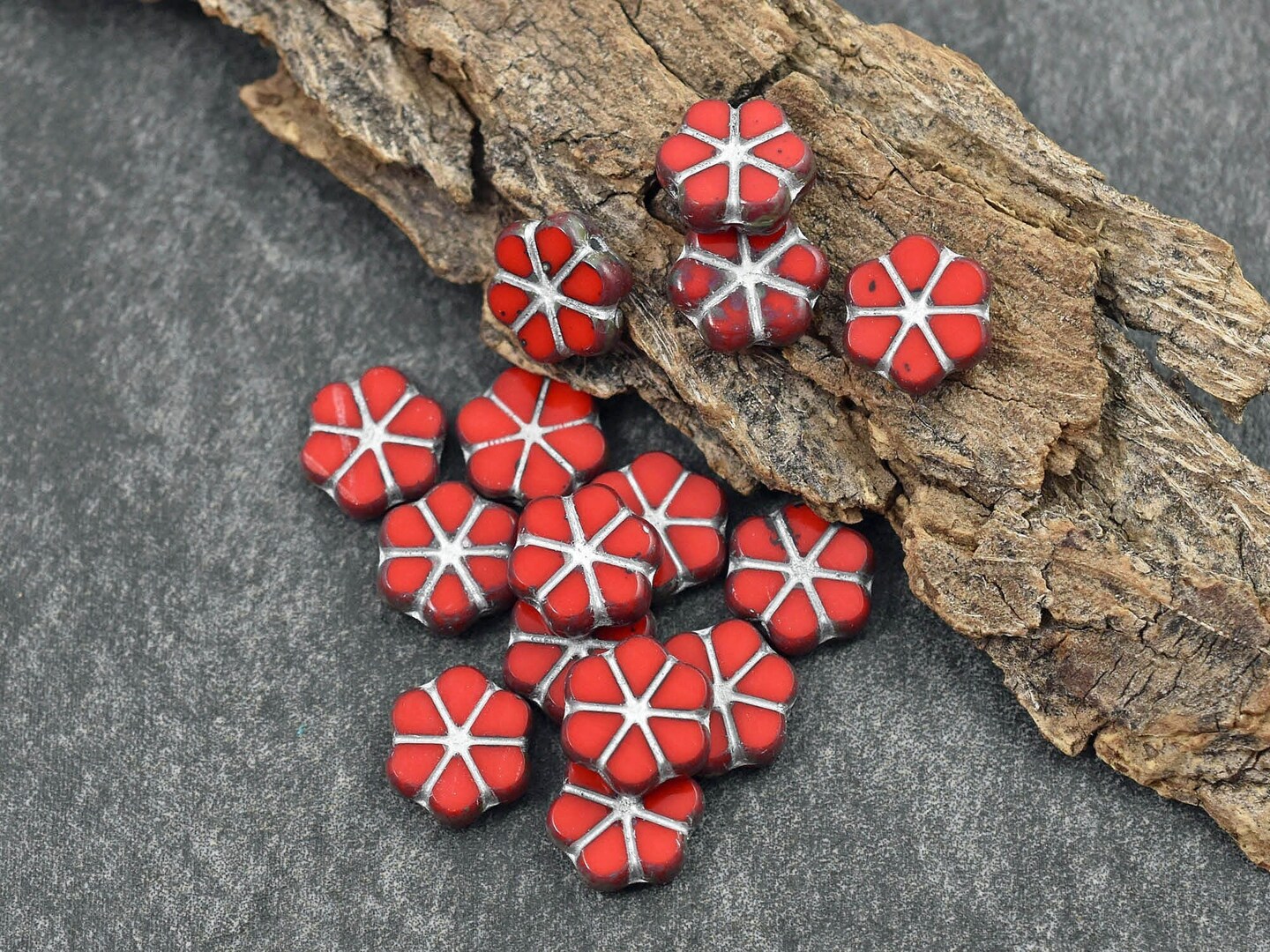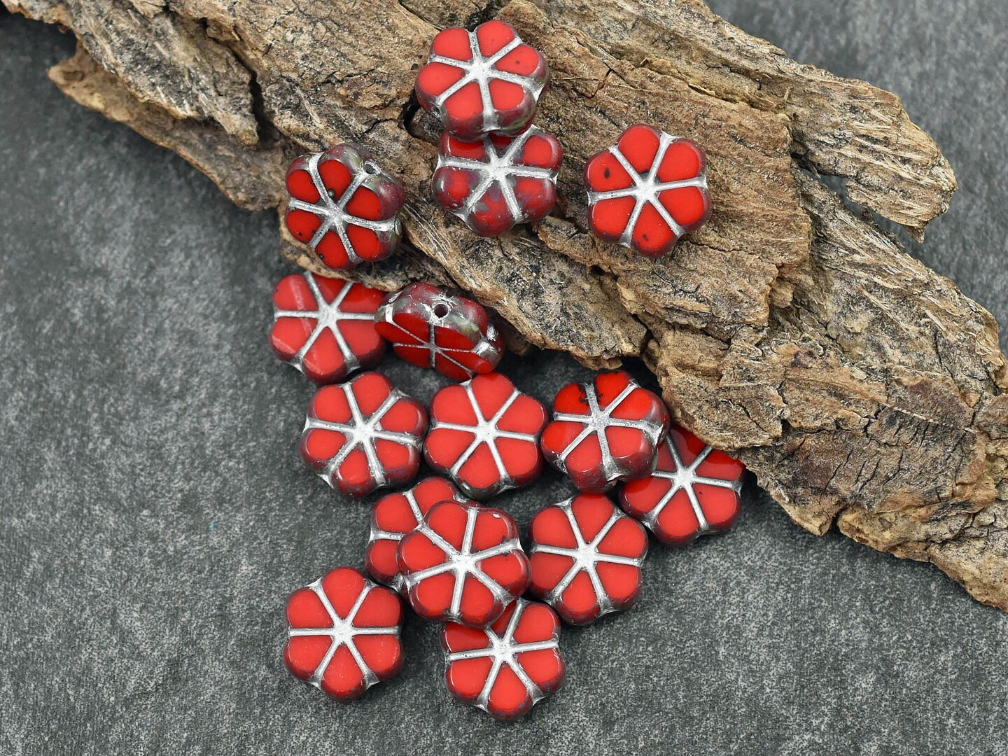 *15* 10mm Silver Washed Opaque Red Travertine Forget Me Not Flower Beads
