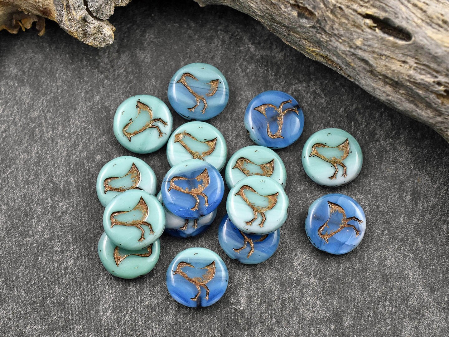 *15* 12mm Dark Bronze Washed Turquoise Aqua Cream Bird Coin Beads