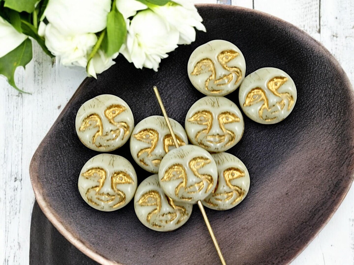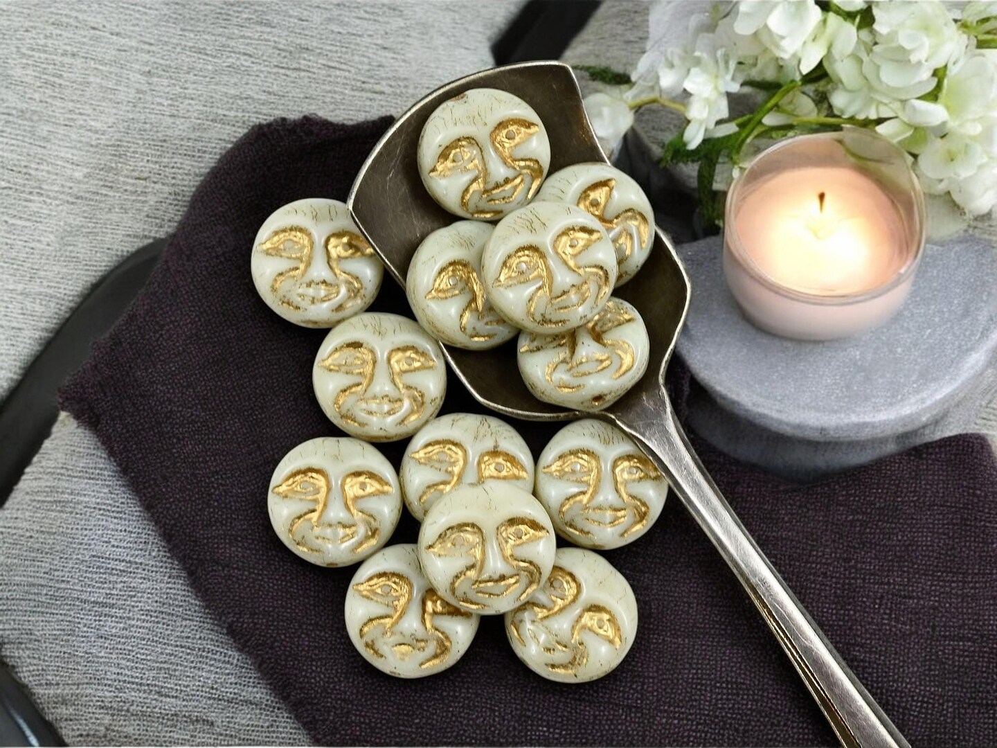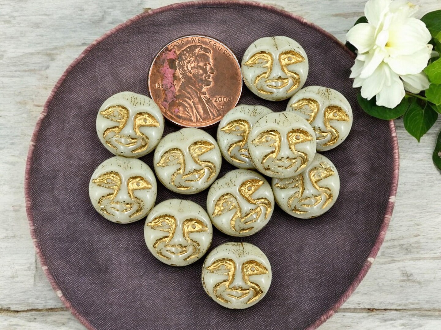 *15* 13mm Gold Washed Opaque Ivory Moon Face Coin Beads