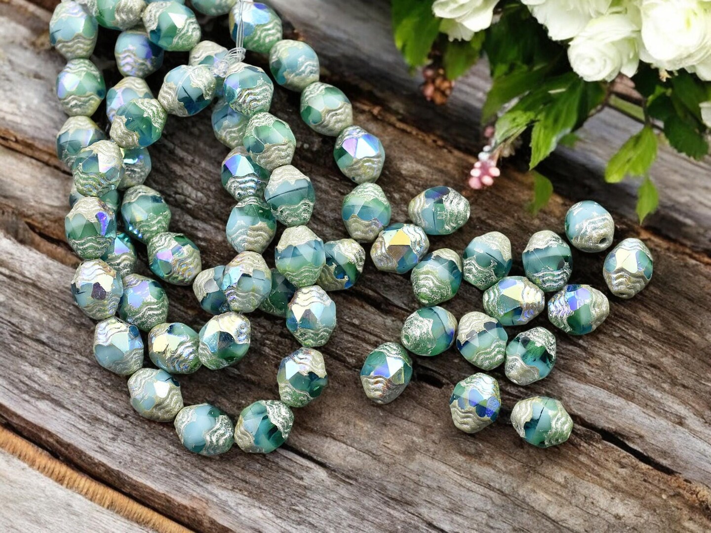 *15* 6x8mm Antique Silver AB Washed Blended Green & Blue Oval Cathedral Beads