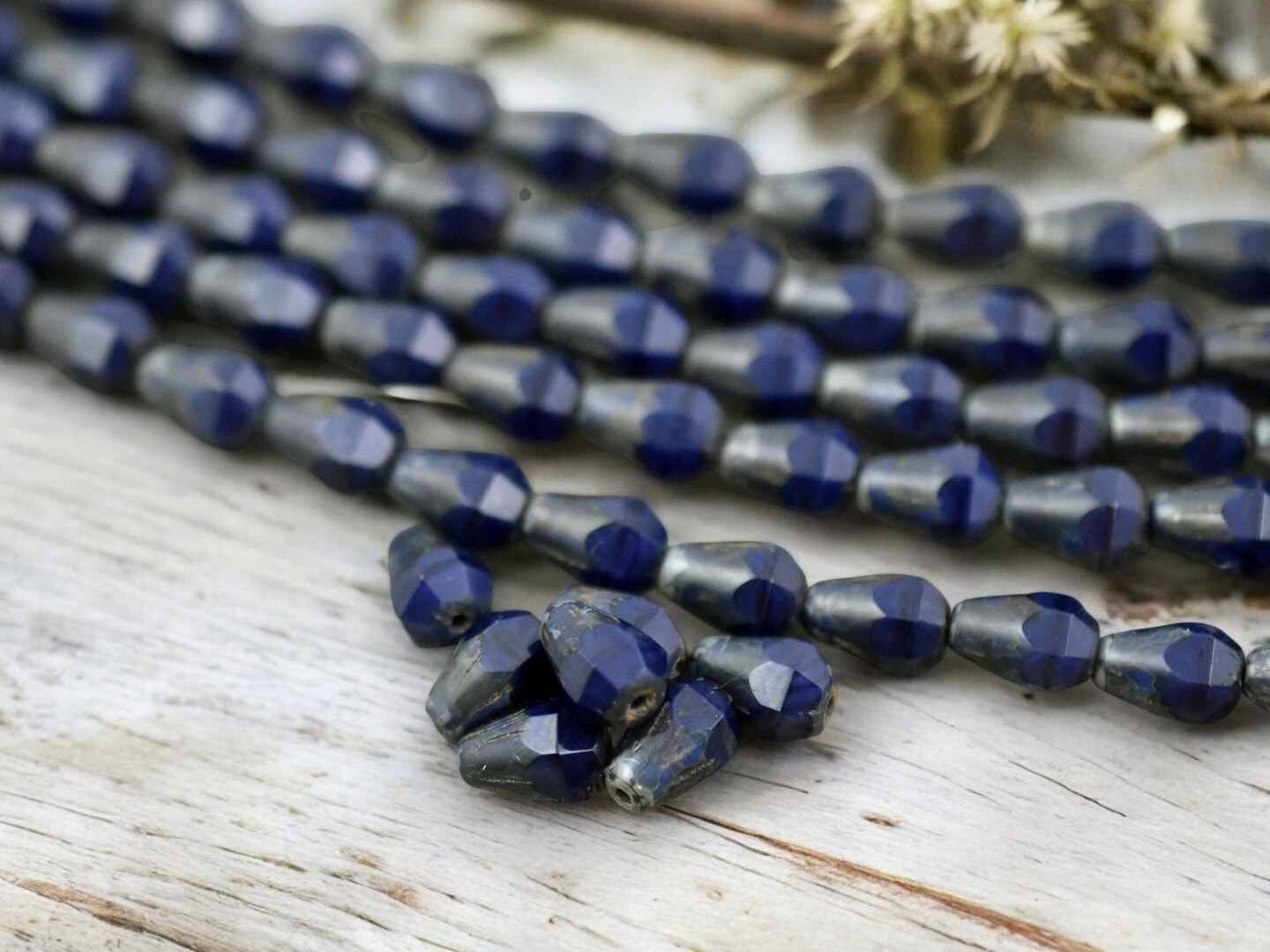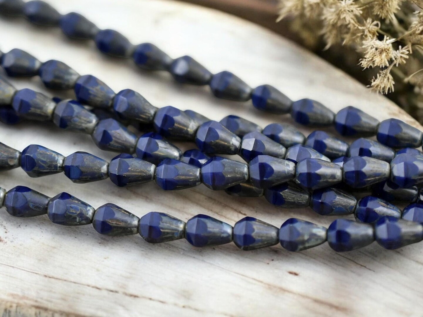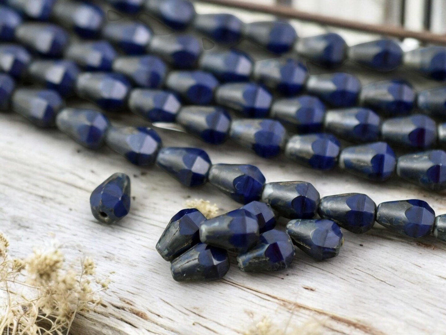 *15* 6x8mm Navy Blue Picasso Vertical Teardrop Beads