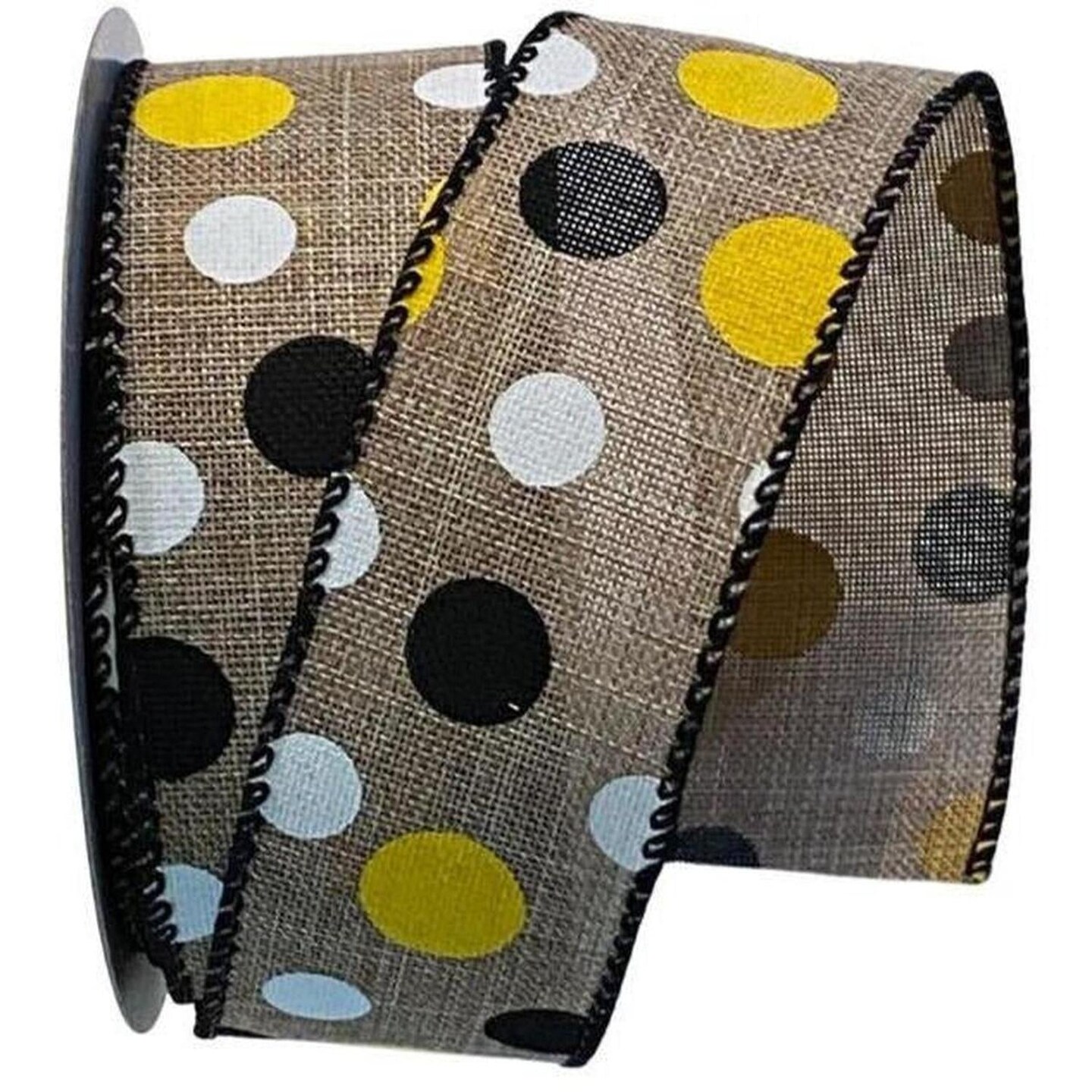 1.5" Natural Canvas Ribbon: Black, Yellow, White Dots (10 Yards)