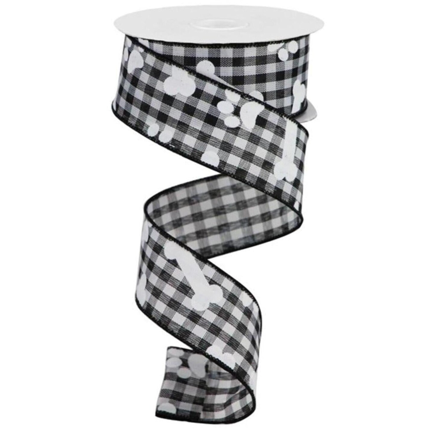 1.5" Paw Print Bone Check Ribbon: Black/White (10 Yards)