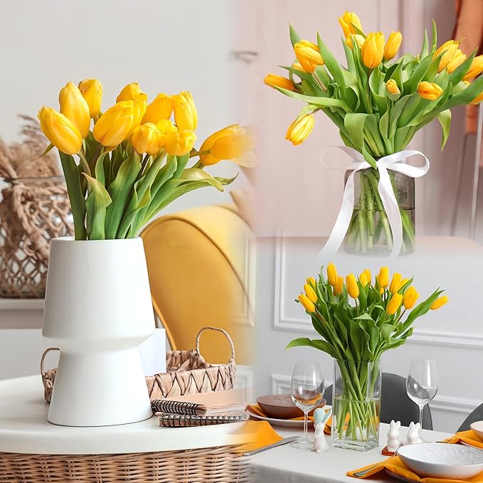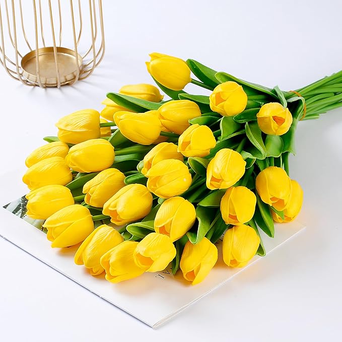 15 Pcs Fake Tulips Artificial Flowers Real Touch PU Faux Flowers Tulip Stems for Wedding Spring Bouquet Floral Arrangement Home Party Office Decorations for Mother's Day (Dark Yellow)