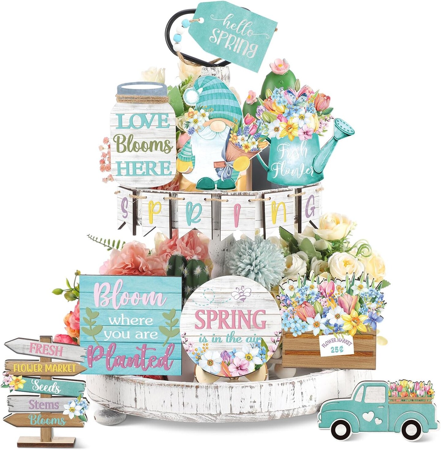 15 Pcs Hello Spring Flower Tiered Tray Decor Colorful Spring Wooden Table Centerpiece Rustic Flower Tulip Easter Home Decoration (Novel)