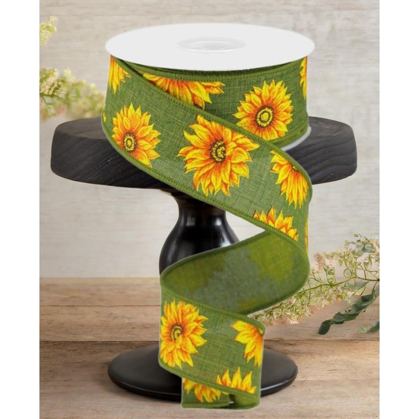 1.5" Sunflower on Canvas Ribbon: Green (10 Yards)