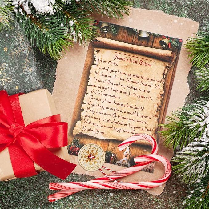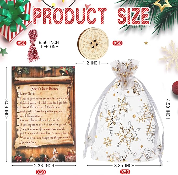 150 Pieces Santa Lost Button with Letter from Santa and Snowflakes Organza Bags Santa Claus Lost Button Ornament North Pole Express Letter for Christmas Morning Xmas Tree Fireplace