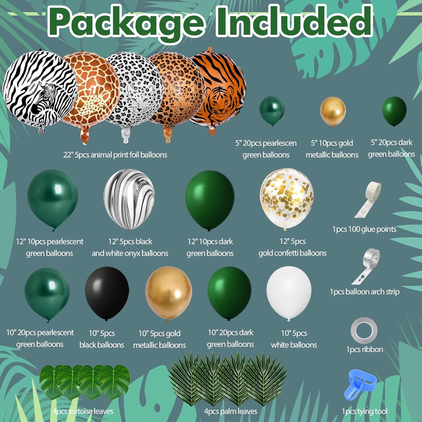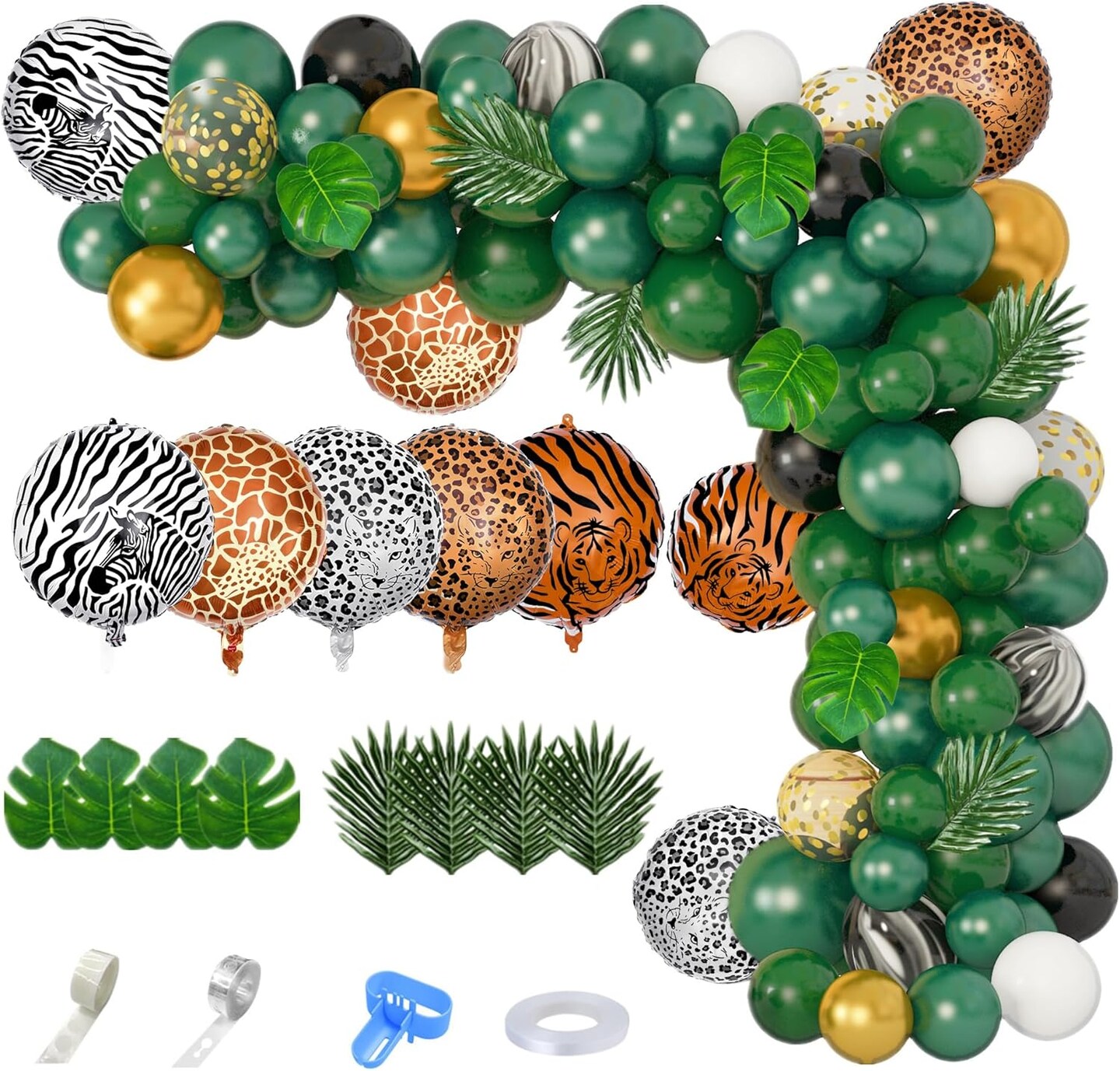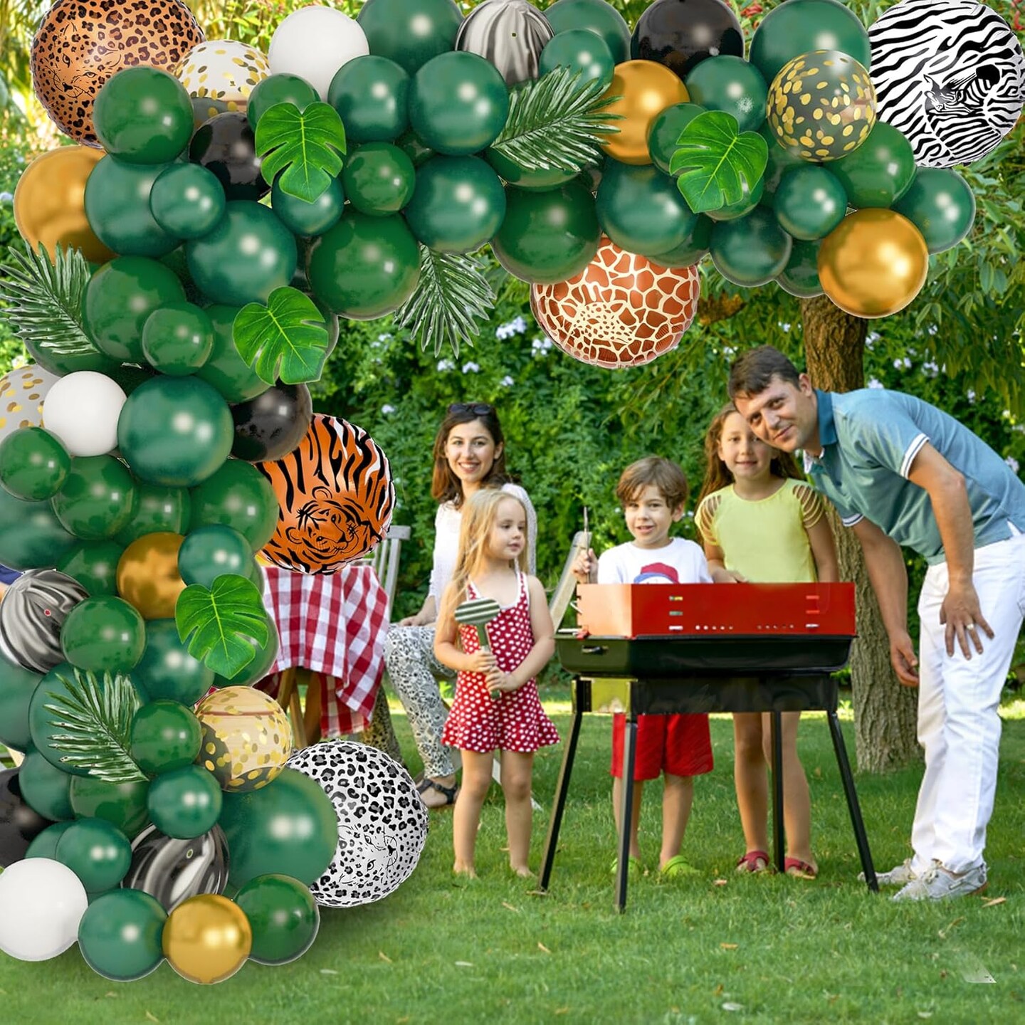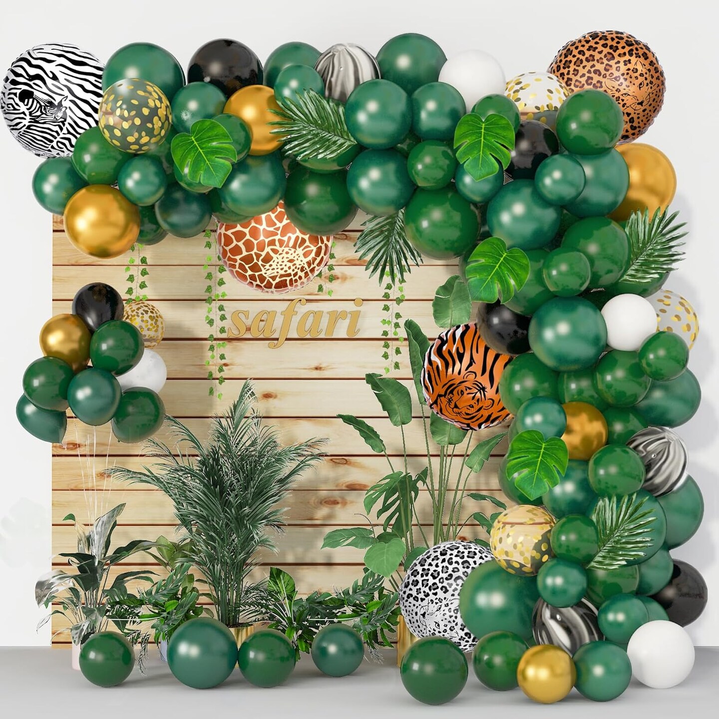 152Pcs Jungle Safari Balloon Garland Arch Kit, Gold Dark Green Animal Balloons Artificial Tropical Palm Leaves Baby Shower Decorations Boy Girl Wild One Birthday Party Supplies