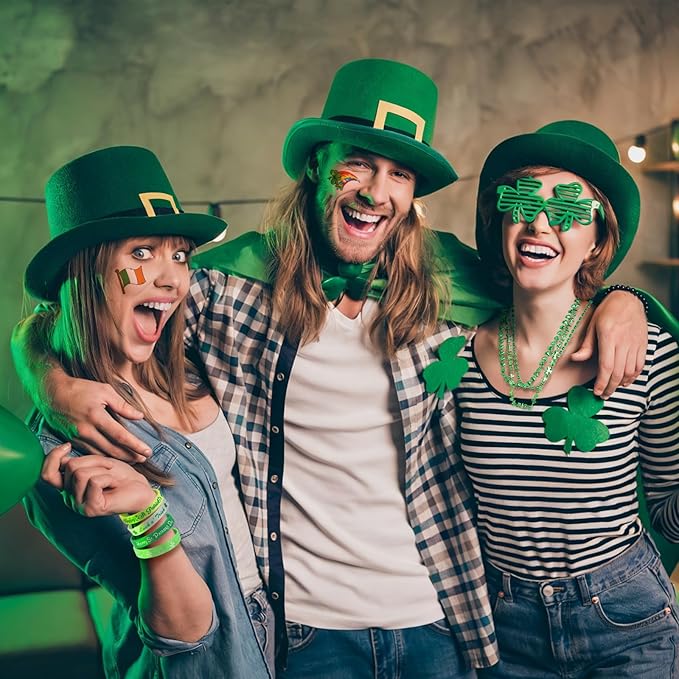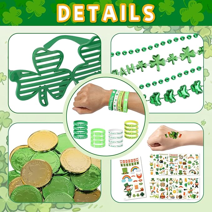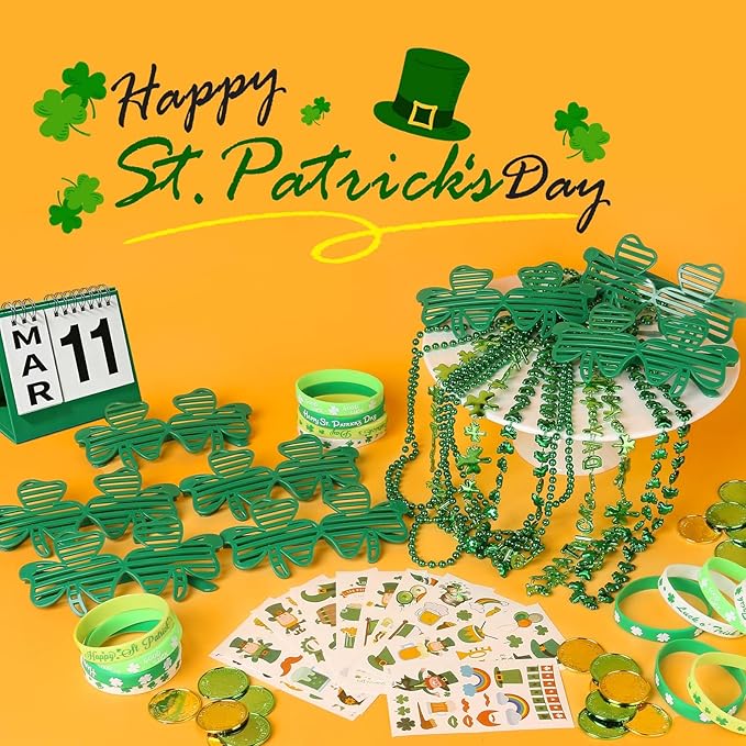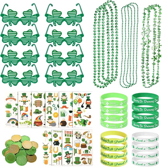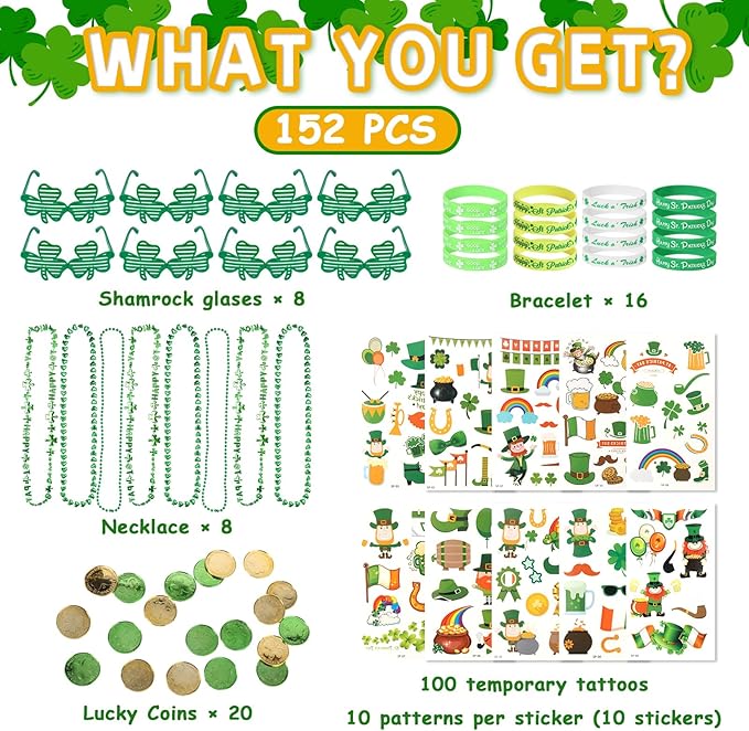 152Pcs St. Patricks Day Accessories Party Favor Set, Shamrock Glasses, Irish Themed Tattoo Stickers, Coins, Bracelets and Necklaces Irish Decor Favors Set for Home Saint Patrick Themed Party Supplies