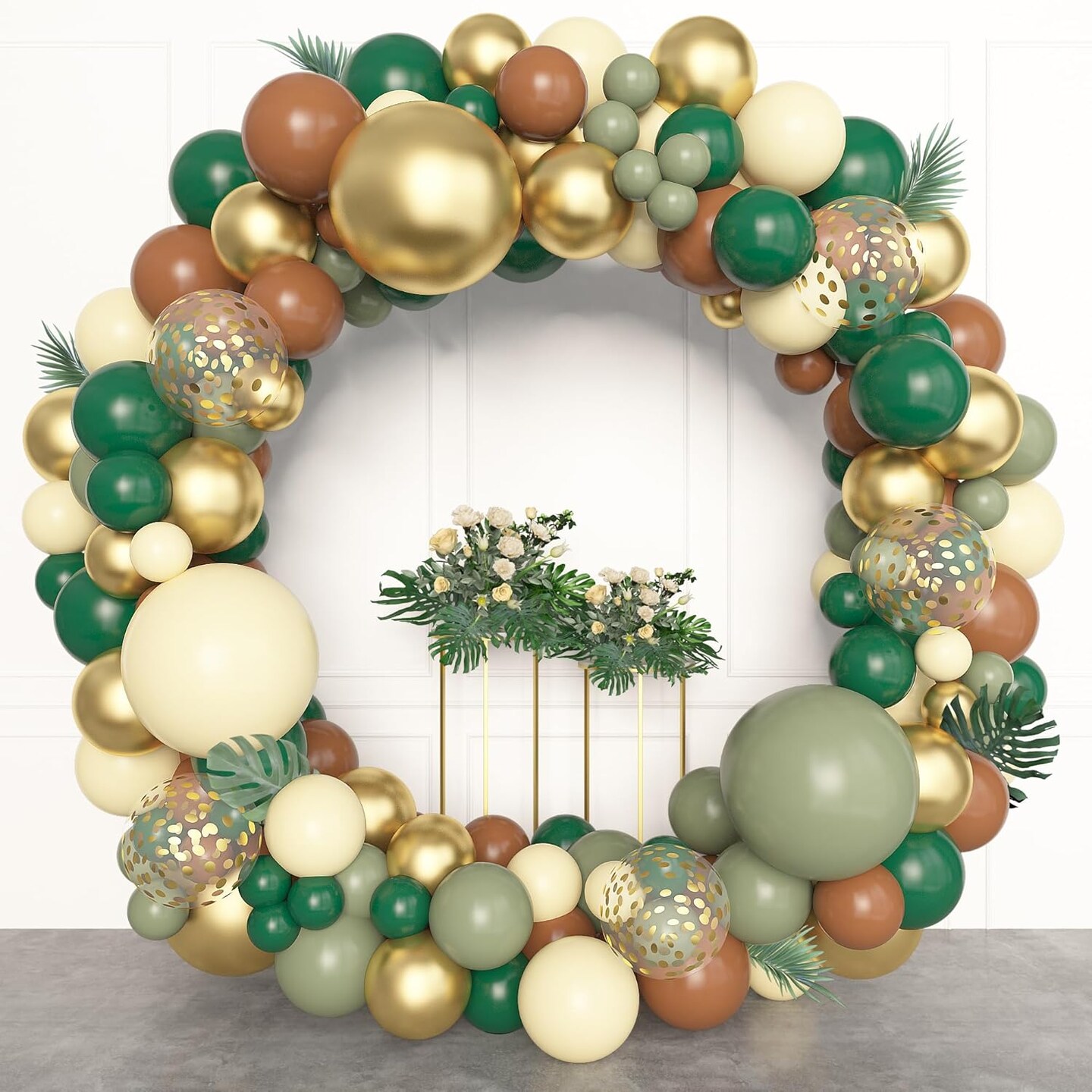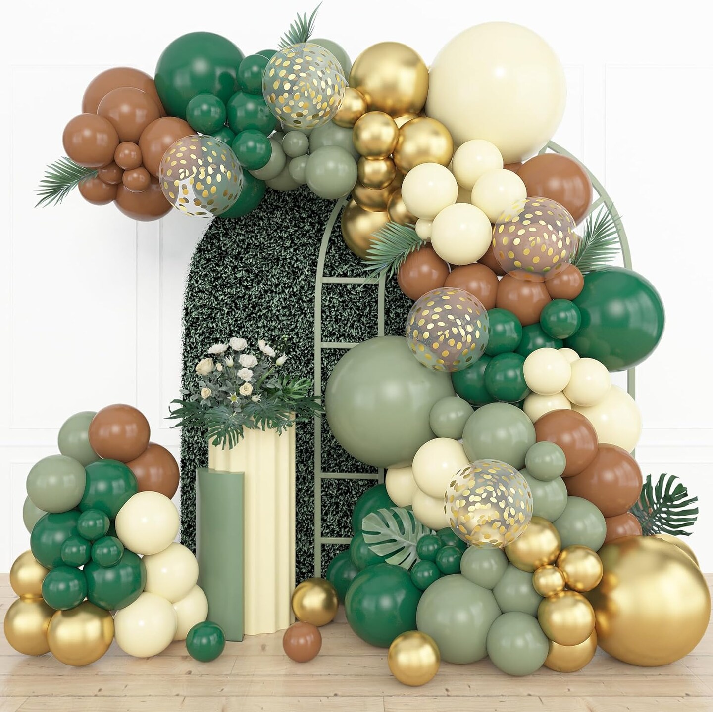 153pcs Green Brown Balloon Garland Arch Kit, Different Sizes 18 12 10 5 inch Sage Green Ivory Gold Latex Metallic Confetti Balloon for Safari Jungle Wild One Woodland Tropical Party Decoration