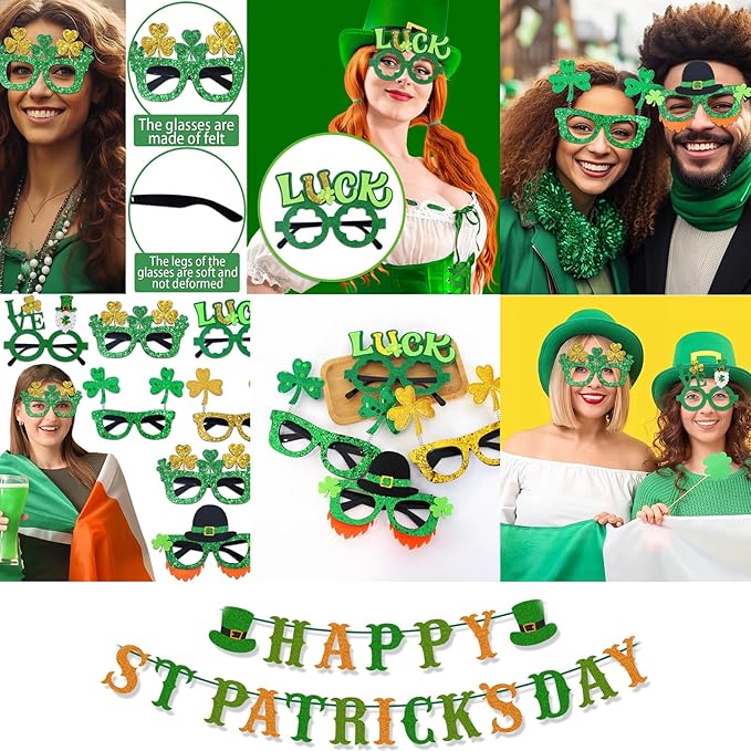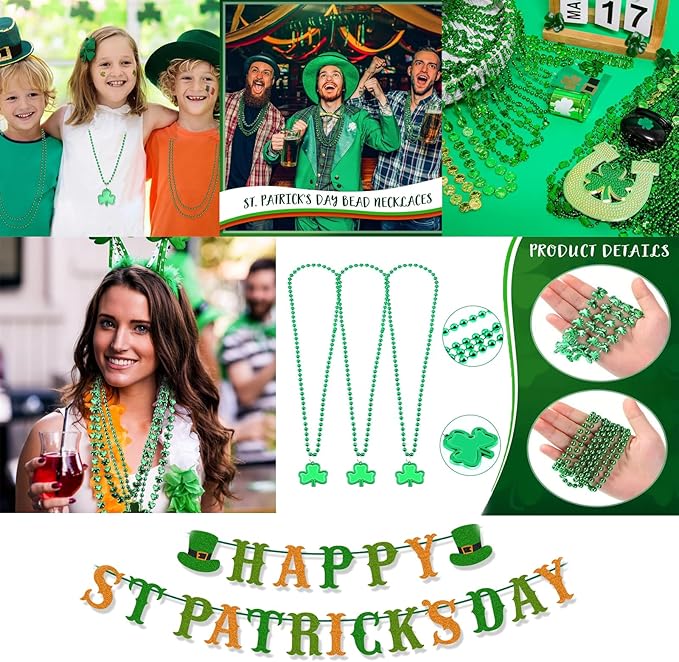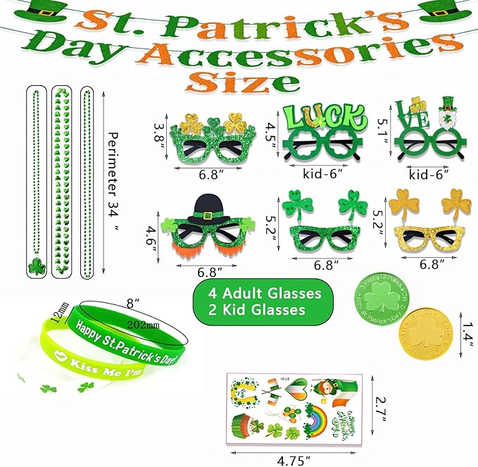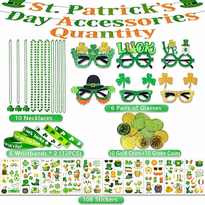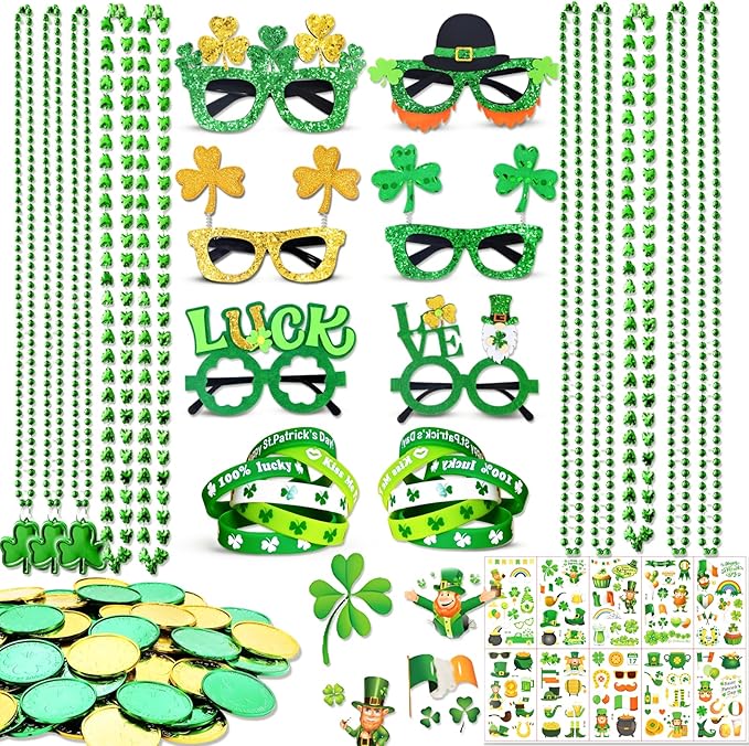 156Pcs St. Patricks Day Accessories Set, 6.8" Shamrock Glasses, 34" Bead Necklaces, Rubber Bracelets, Lucky Coins and Tattoos, Irish Party Favors Decorations Supplies for Parade (156 pcs)