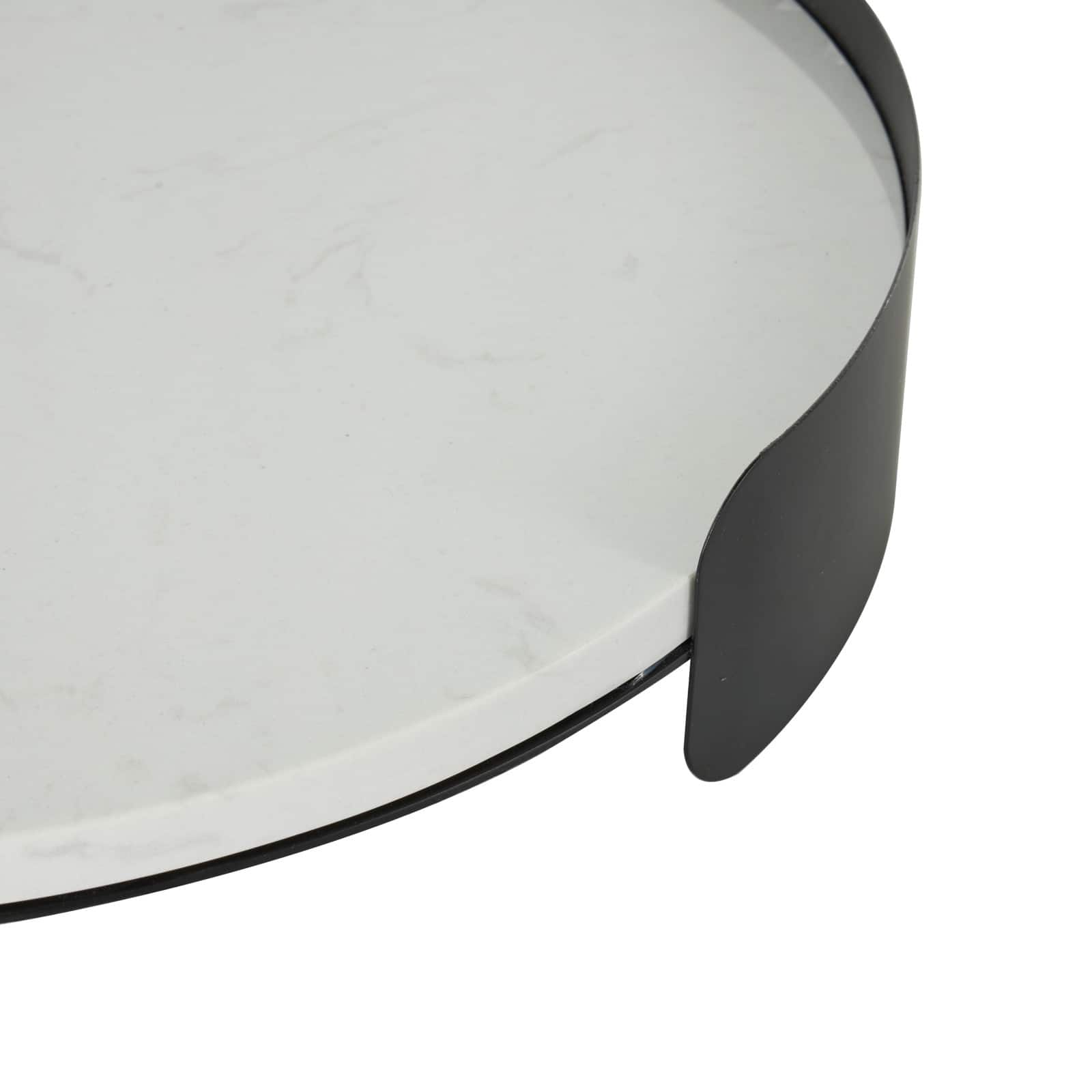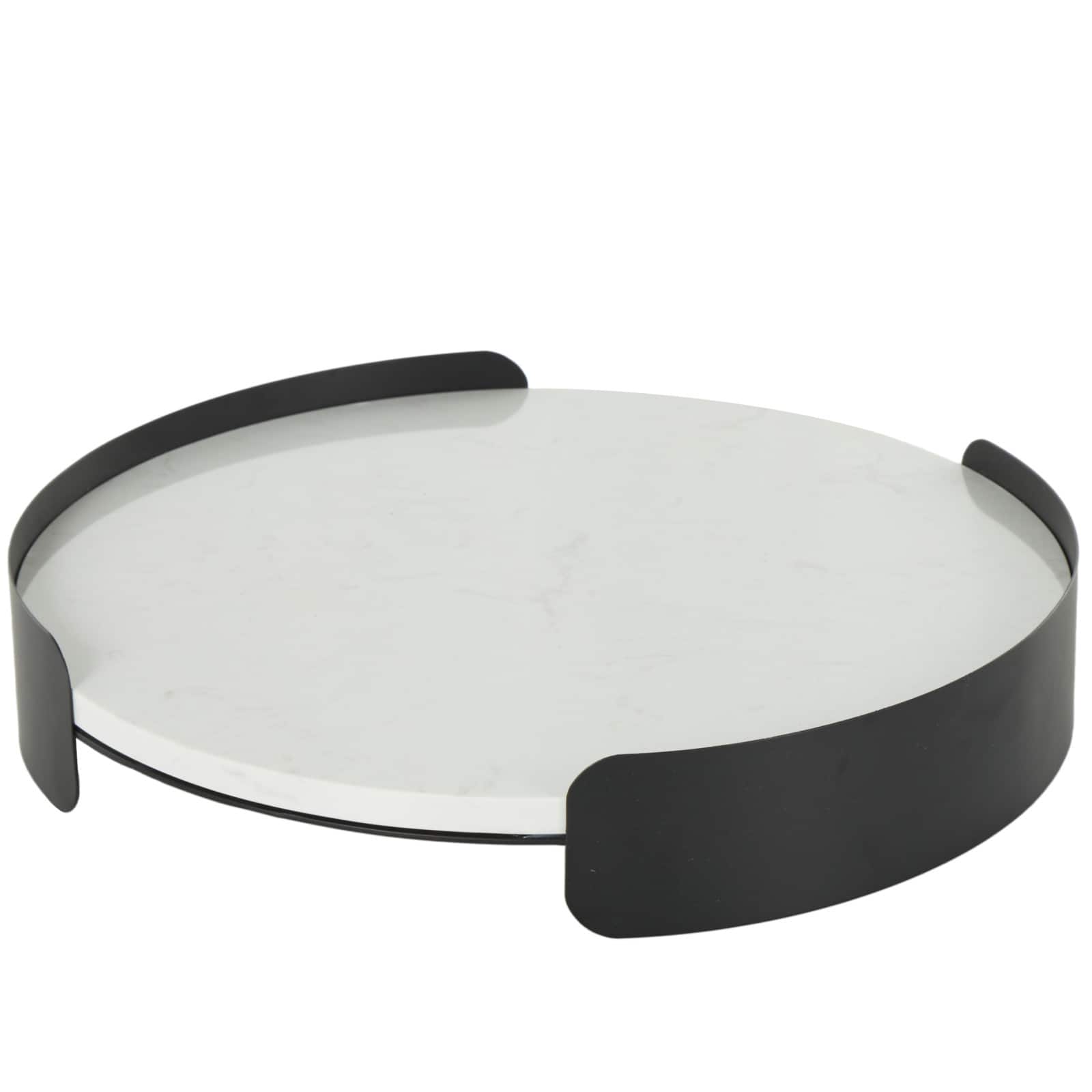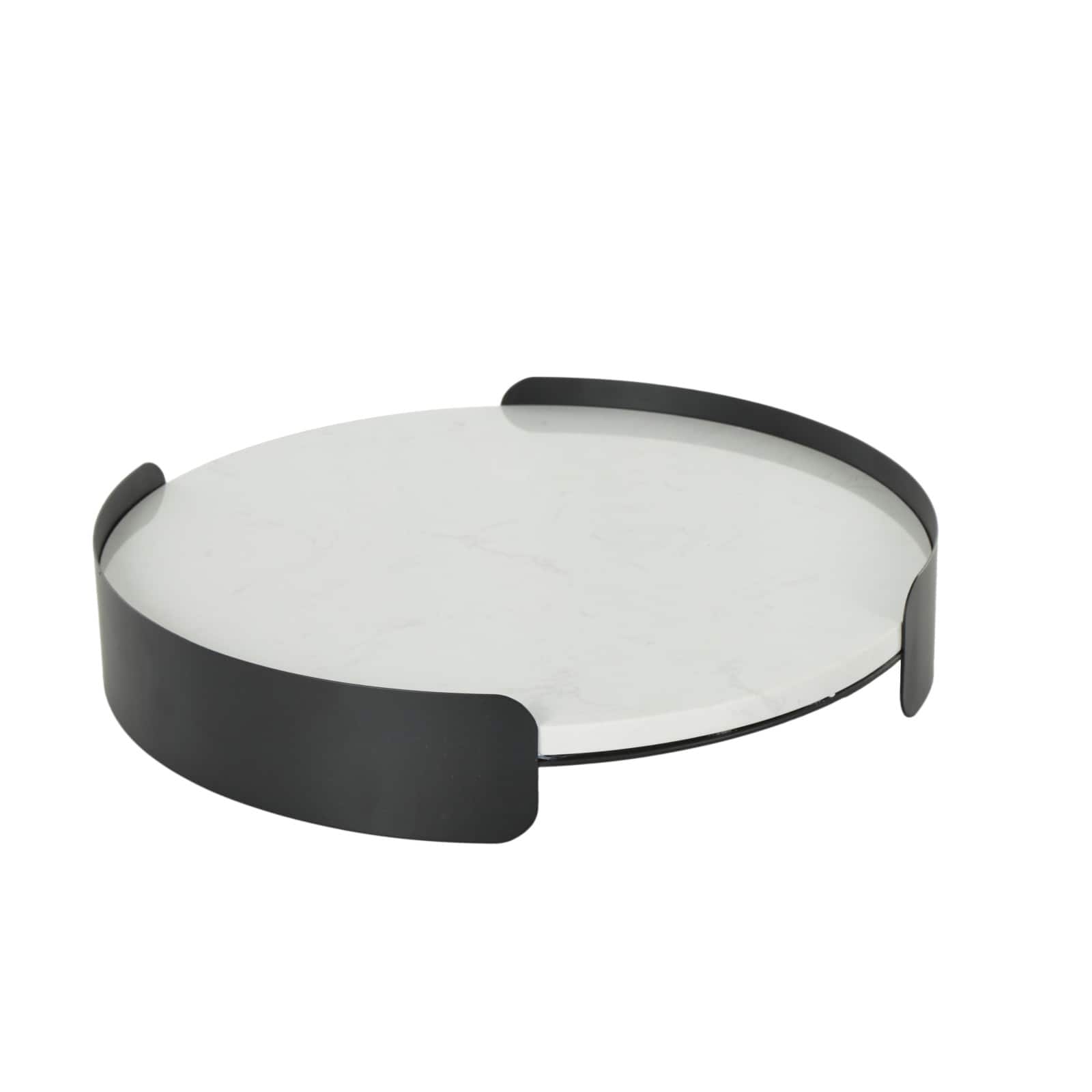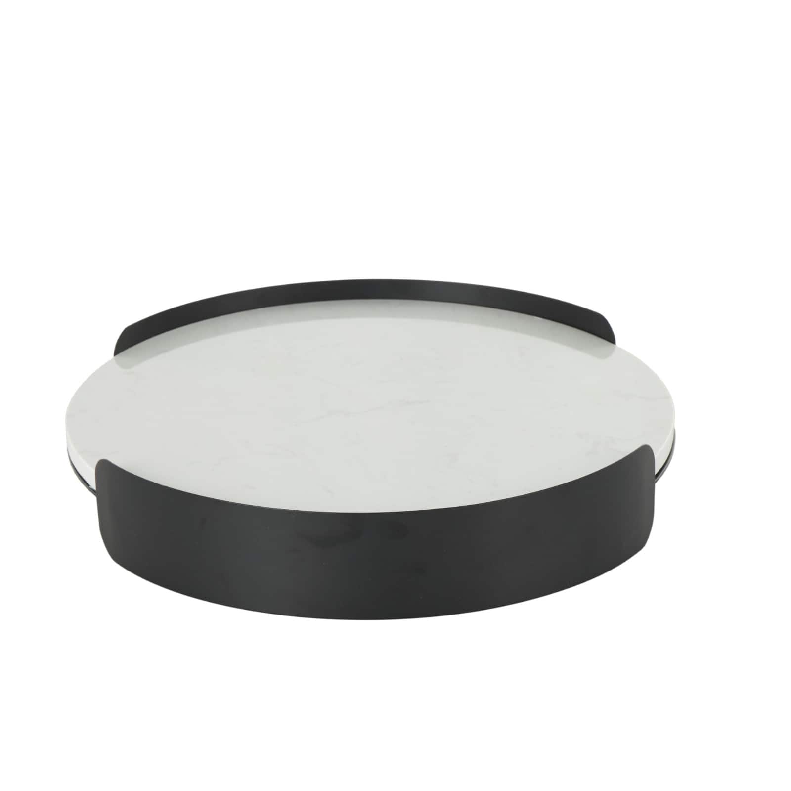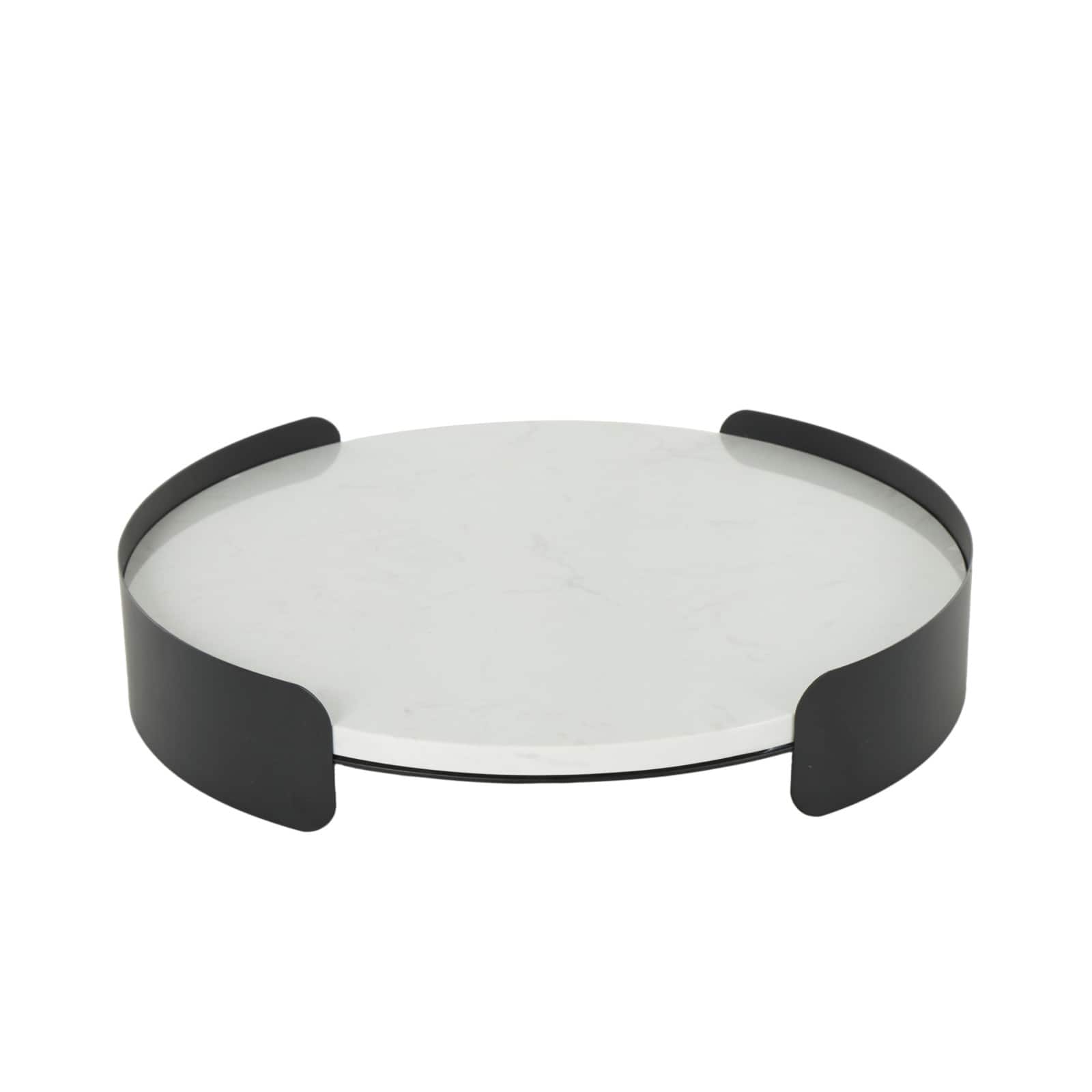 15.75" White Marble Round Living Room Décor Tray with Black Metal Frame
