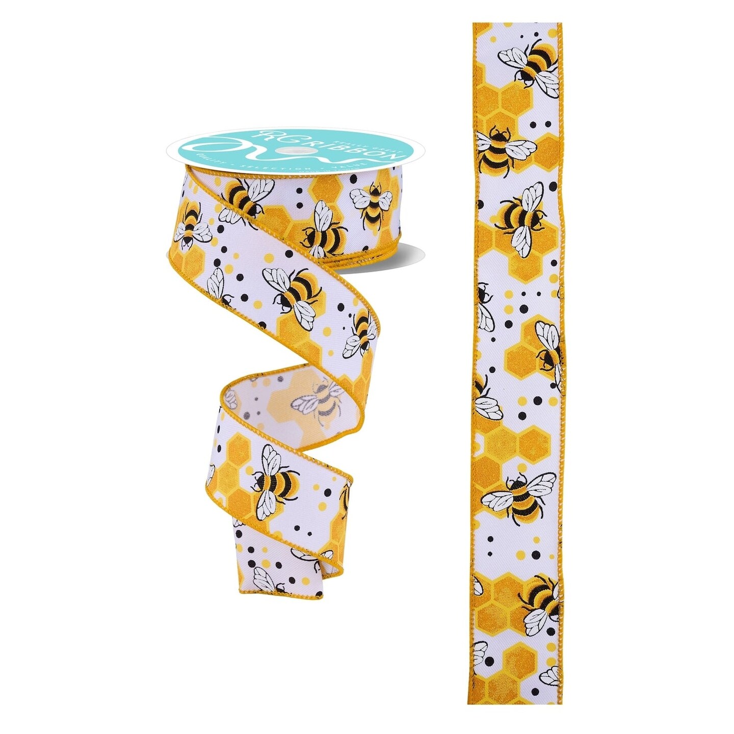 1.5in Bumblebees Honeycomb Ribbon: White (10 Yards)