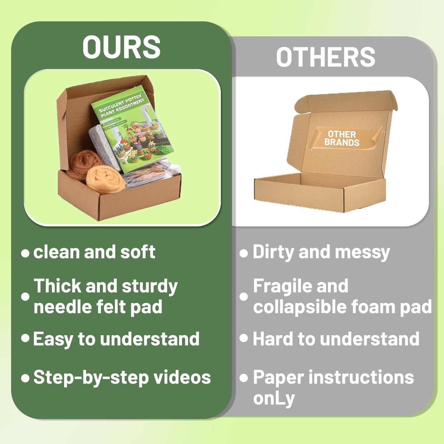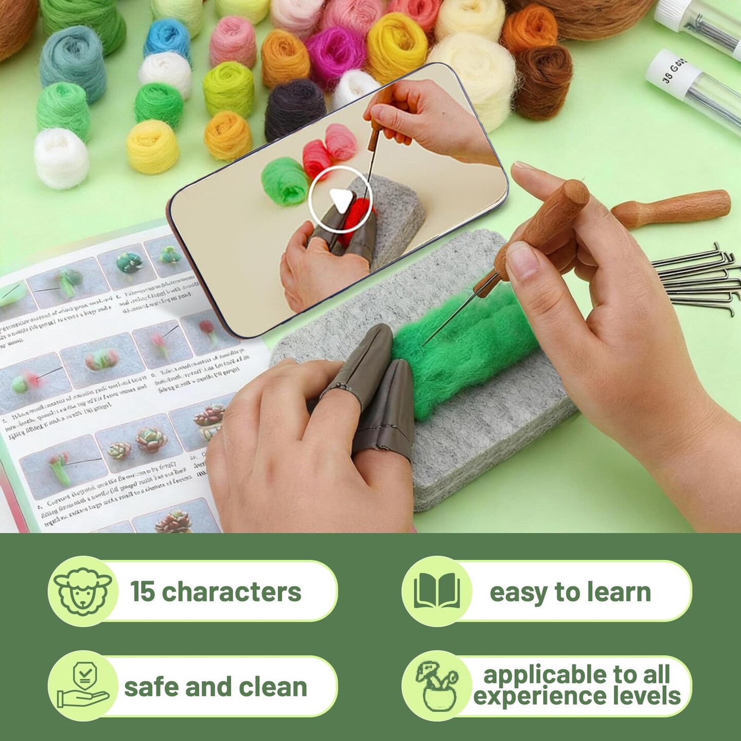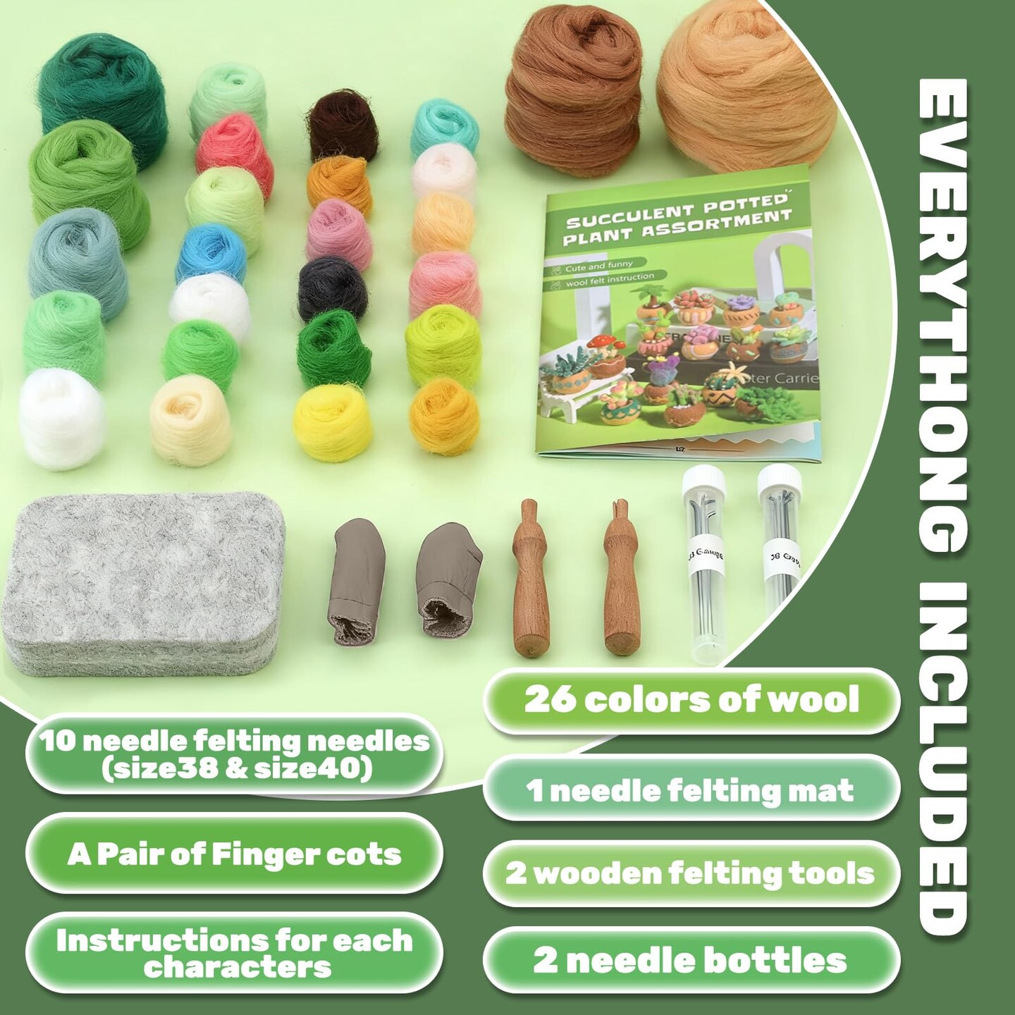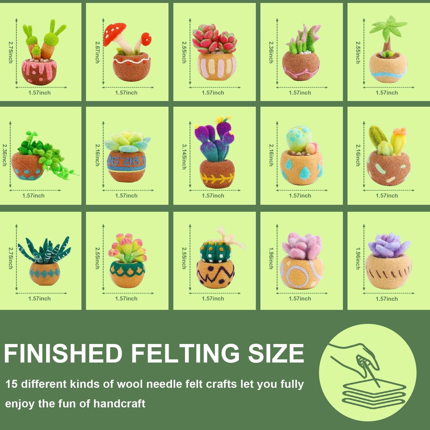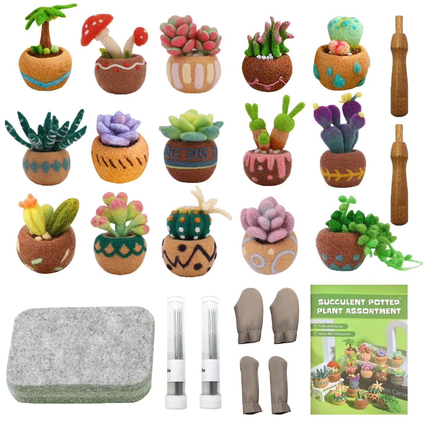 15pcs Succulent Needle Felting Kit for Beginners Adult - DIY Starter Kit with Wool Roving, Felting Mat, Needles, Instructions for Home Decoration Crafts