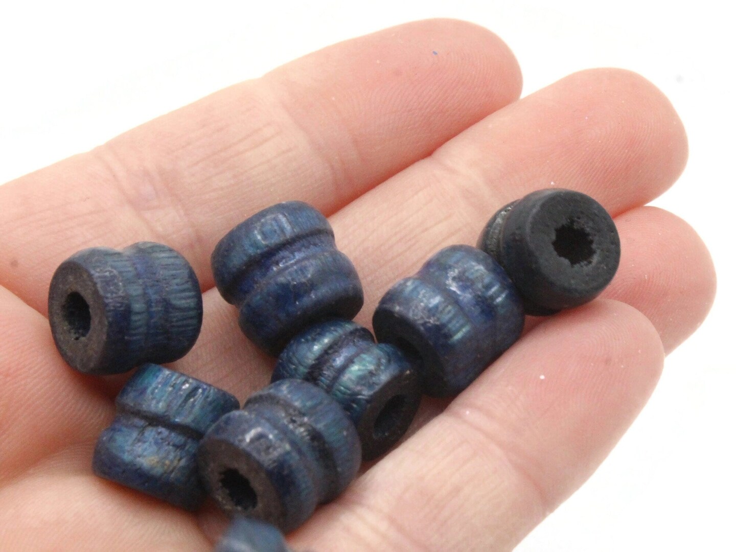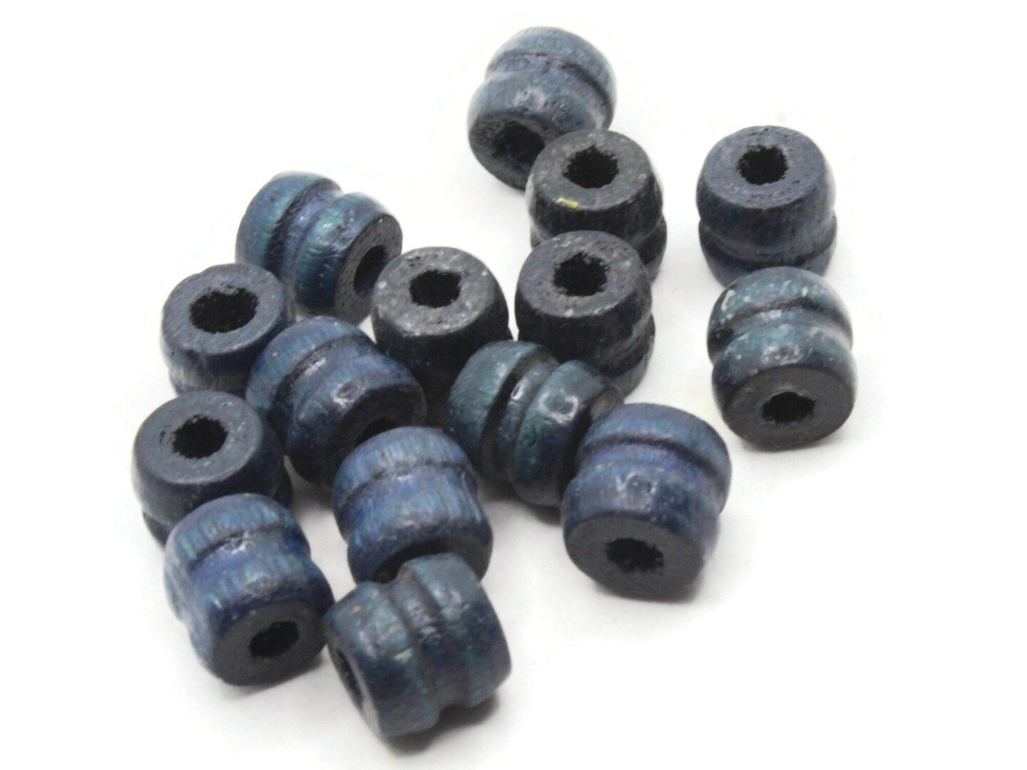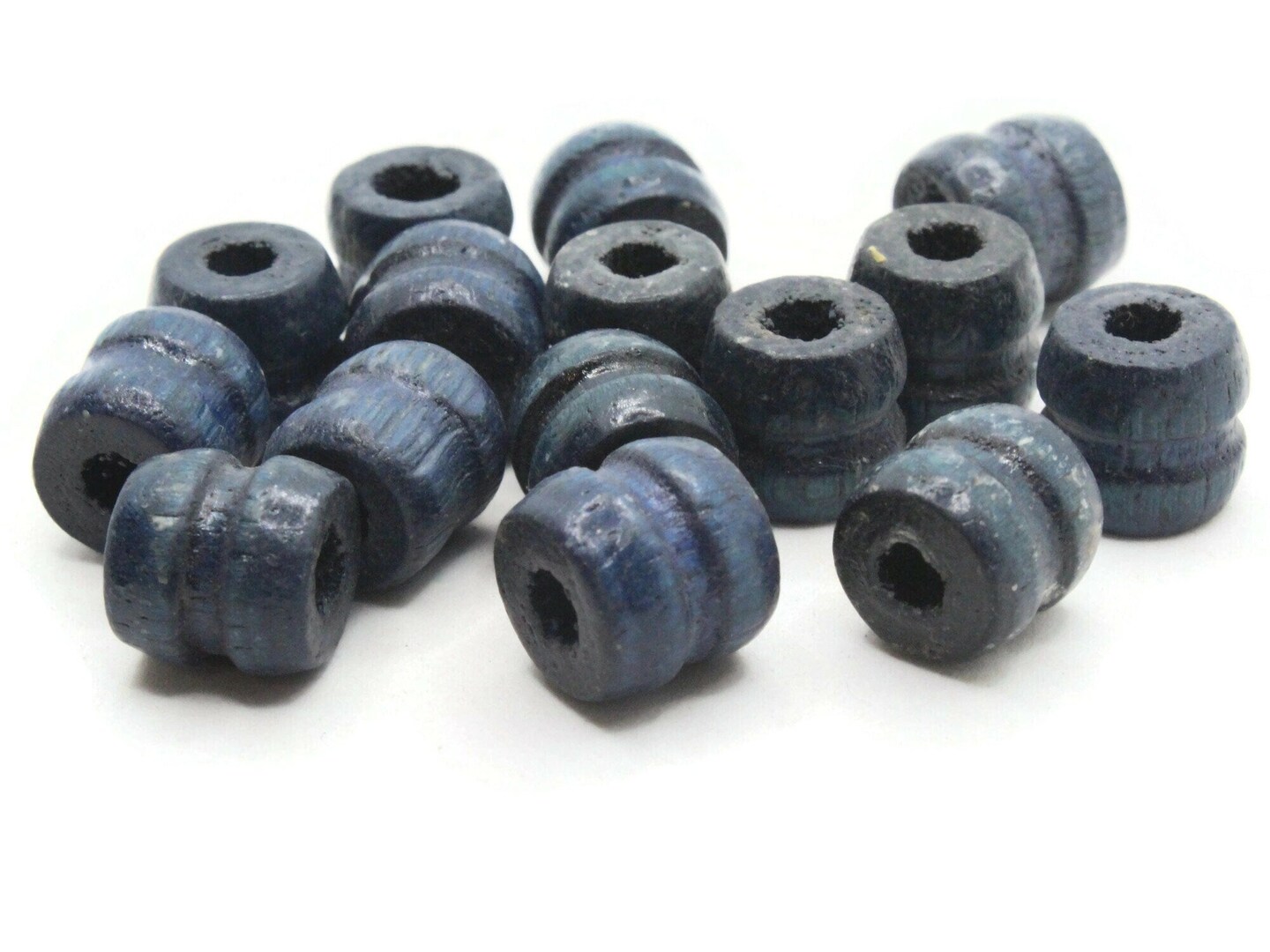 16 11mm Blue Fluted Barrel Large Hole Wood Macrame Beads
