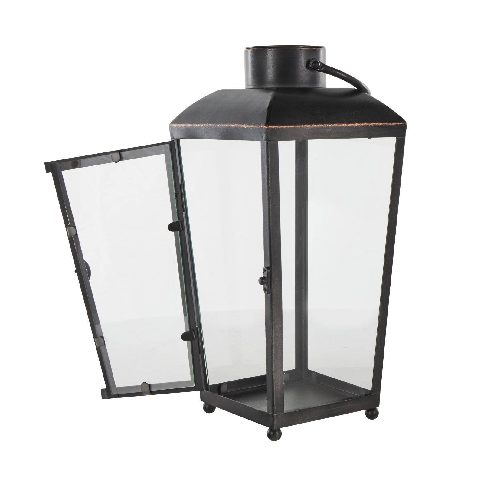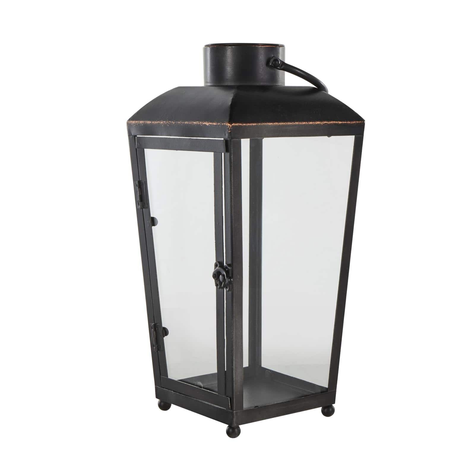 16" Black Metal Modern Candle Lantern with Gold Accents