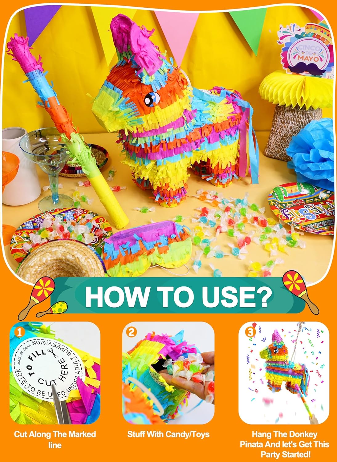 16" Cinco de Mayo Pinata, Large Rainbow Color Donkey Pinata 16 x 13 x 5.5 ln with Stick and Blindfold for Fiestas Mexican Party Decoration, Kids Birthday Party Favors, Taco Tuesday Event