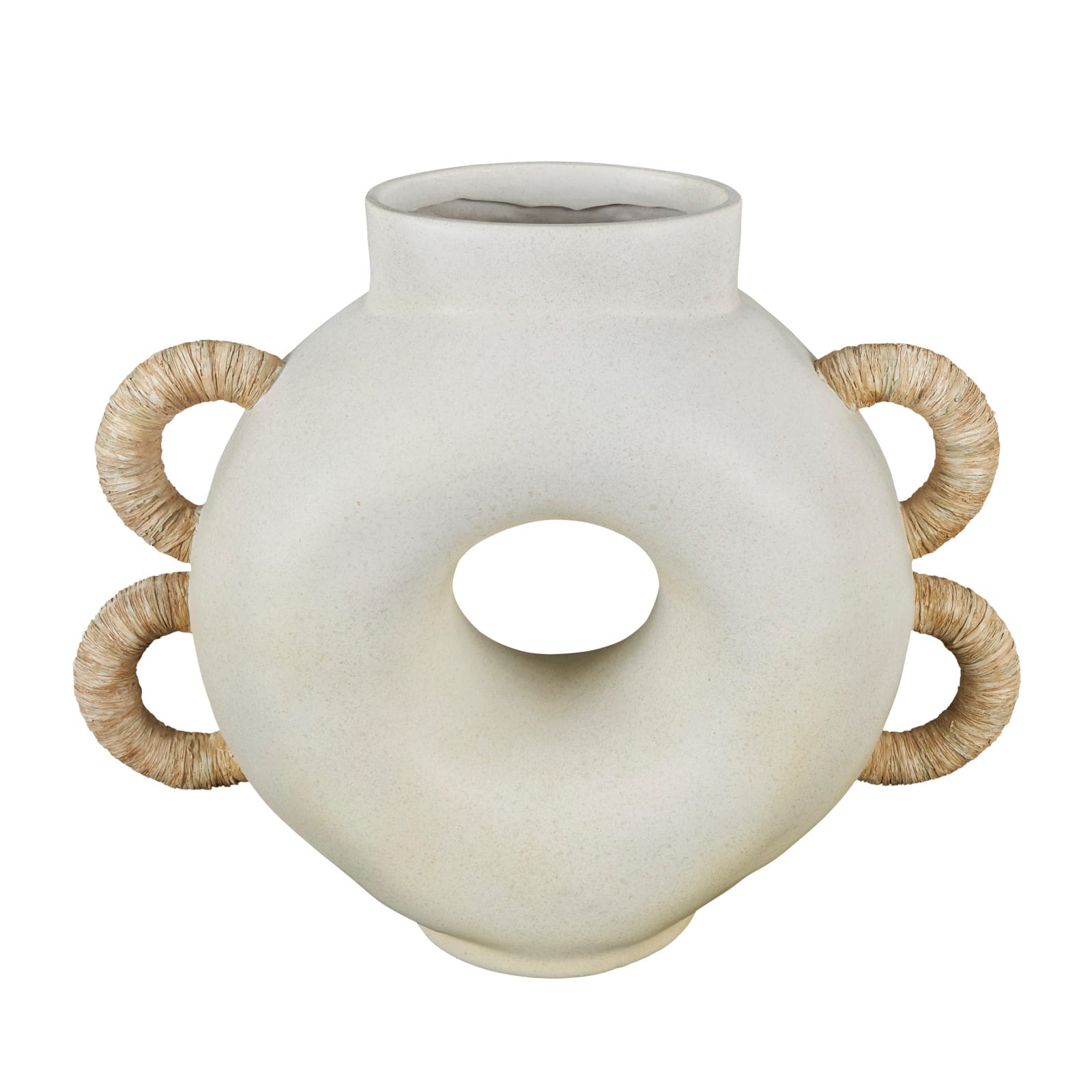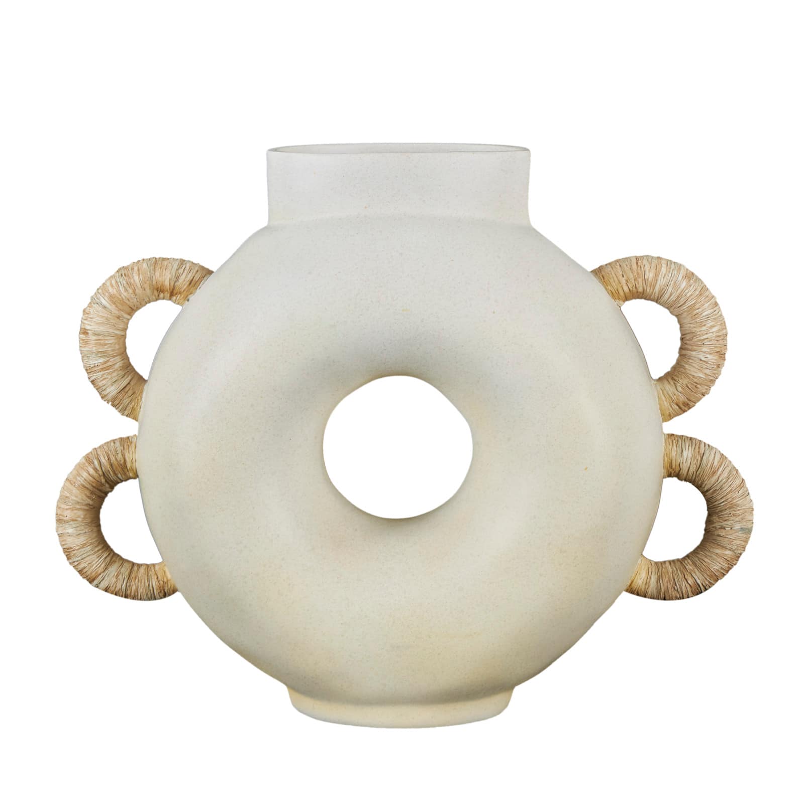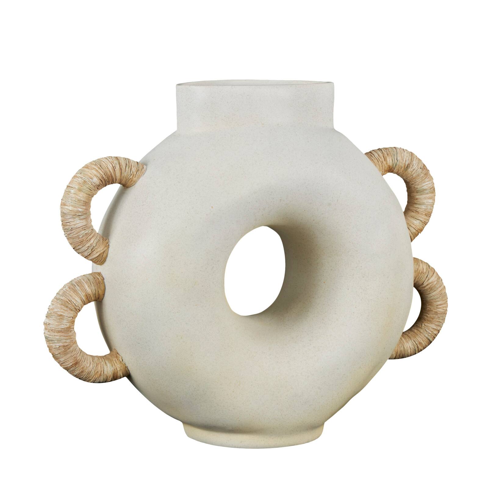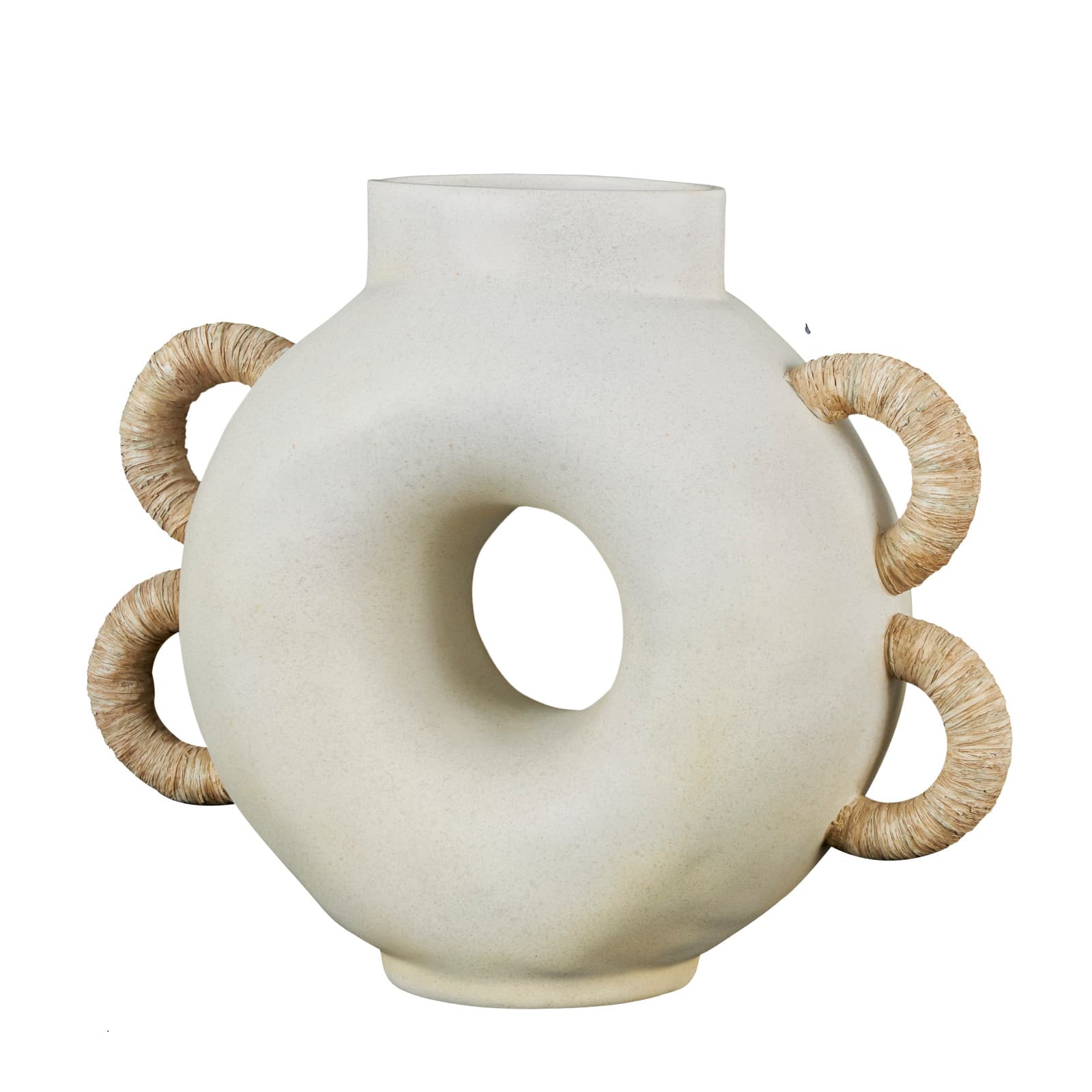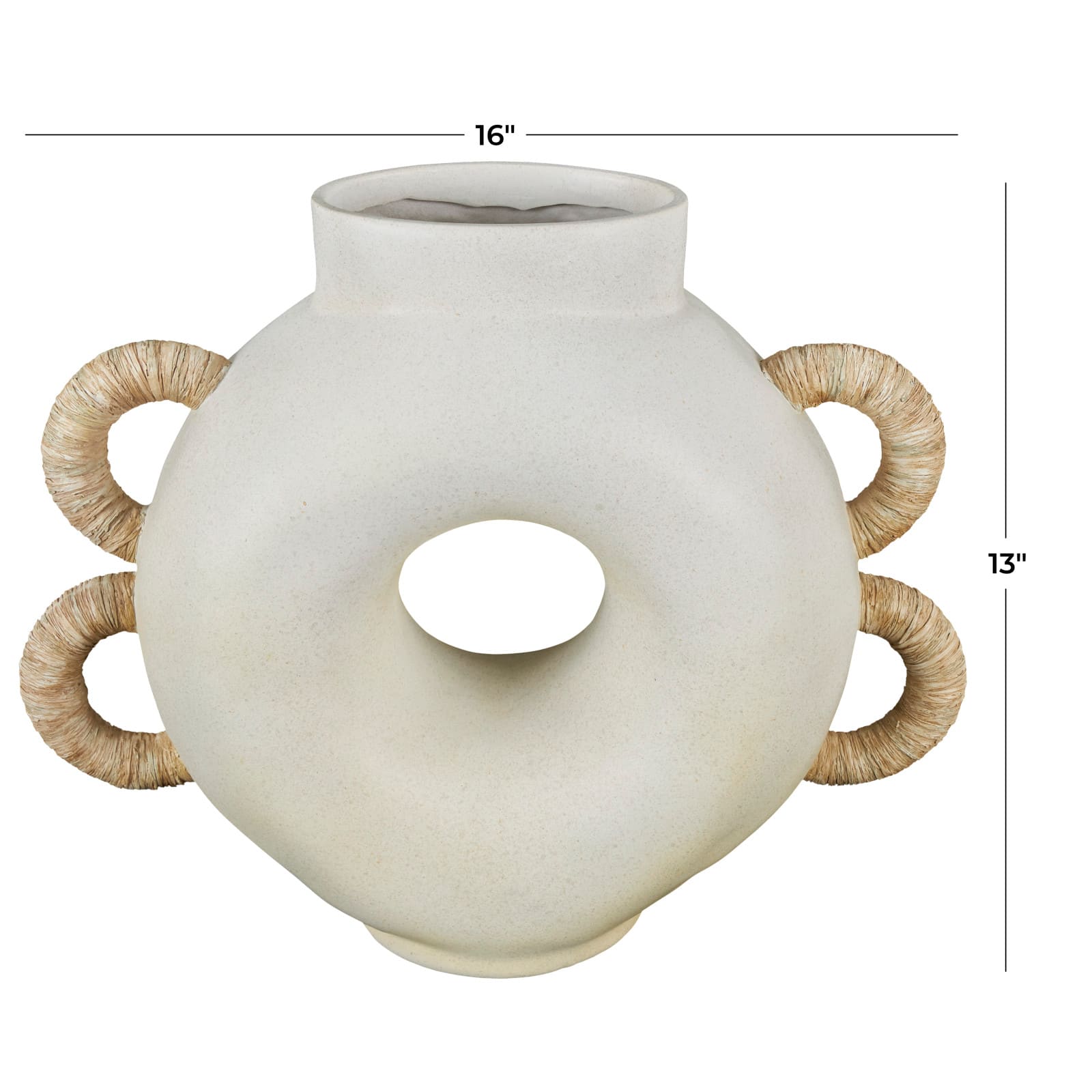 16" Cream Round Speckled Vase with Woven Inspired Arched Handles & Cutout Opening