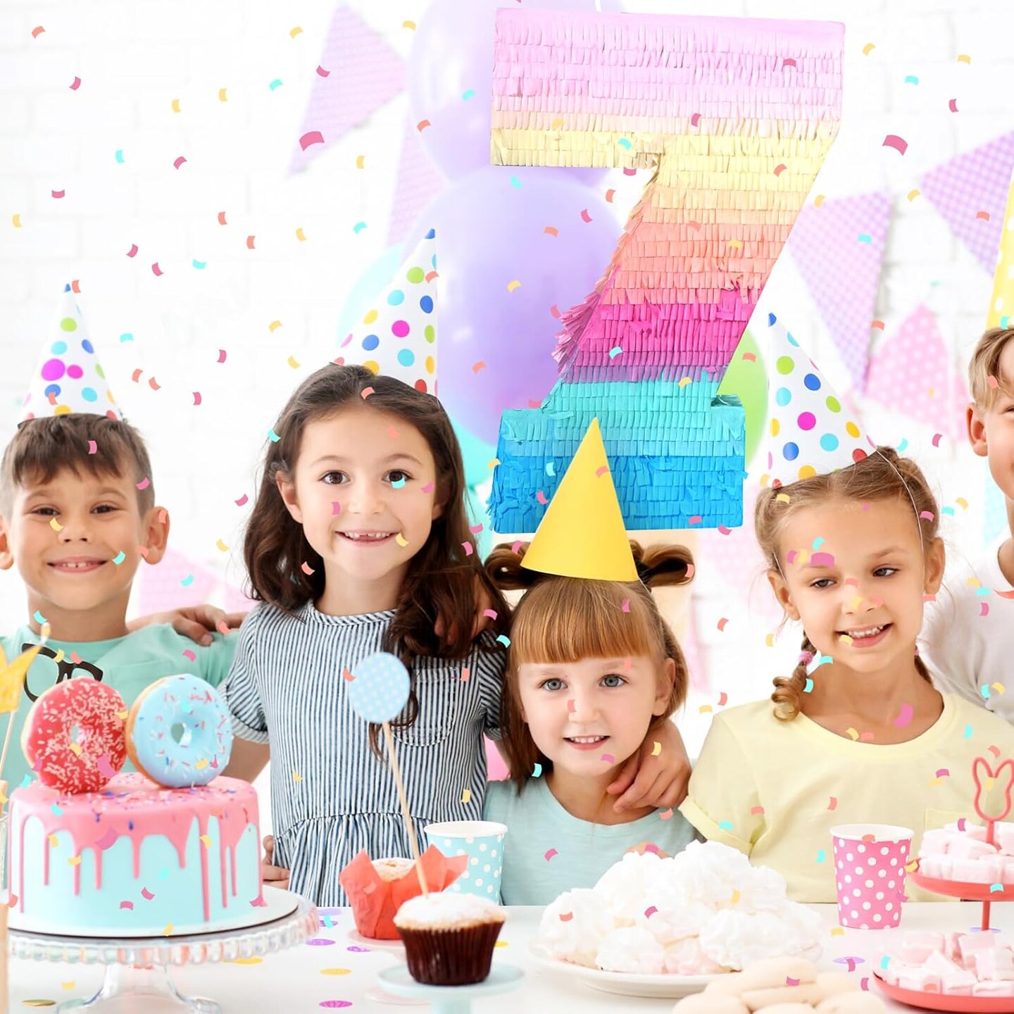 16 Inch Number Piñata Kids Birthday Party Macaron Piñata with Blindfold Stick and Confetti for Unicorn Birthday Wedding Baby Shower Decor(Number 7)
