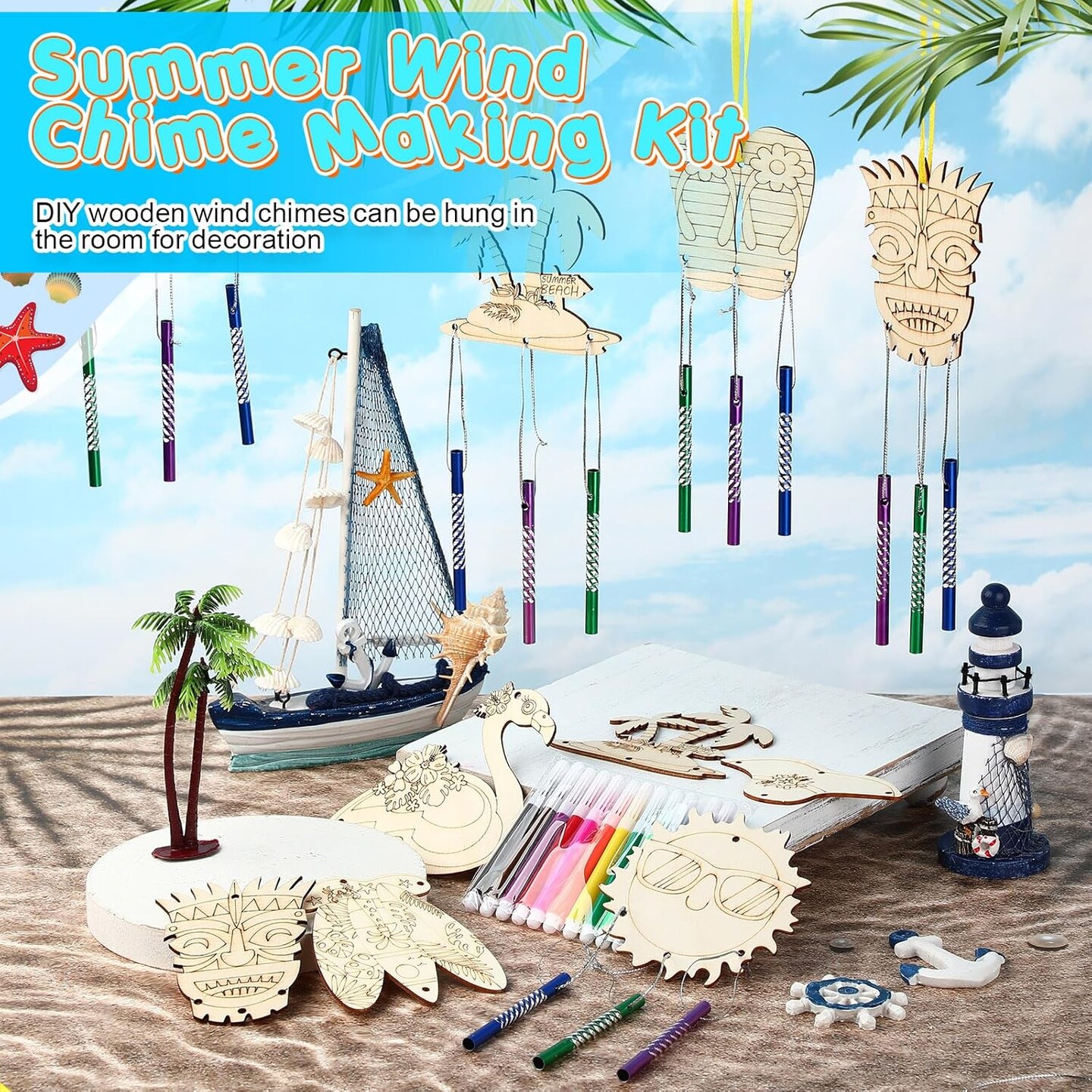 16 Pack Summer Wind Chime Kit Hawaii Craft Make Your Own Flamingos Tiki Surfboard Wind Chime DIY Wooden