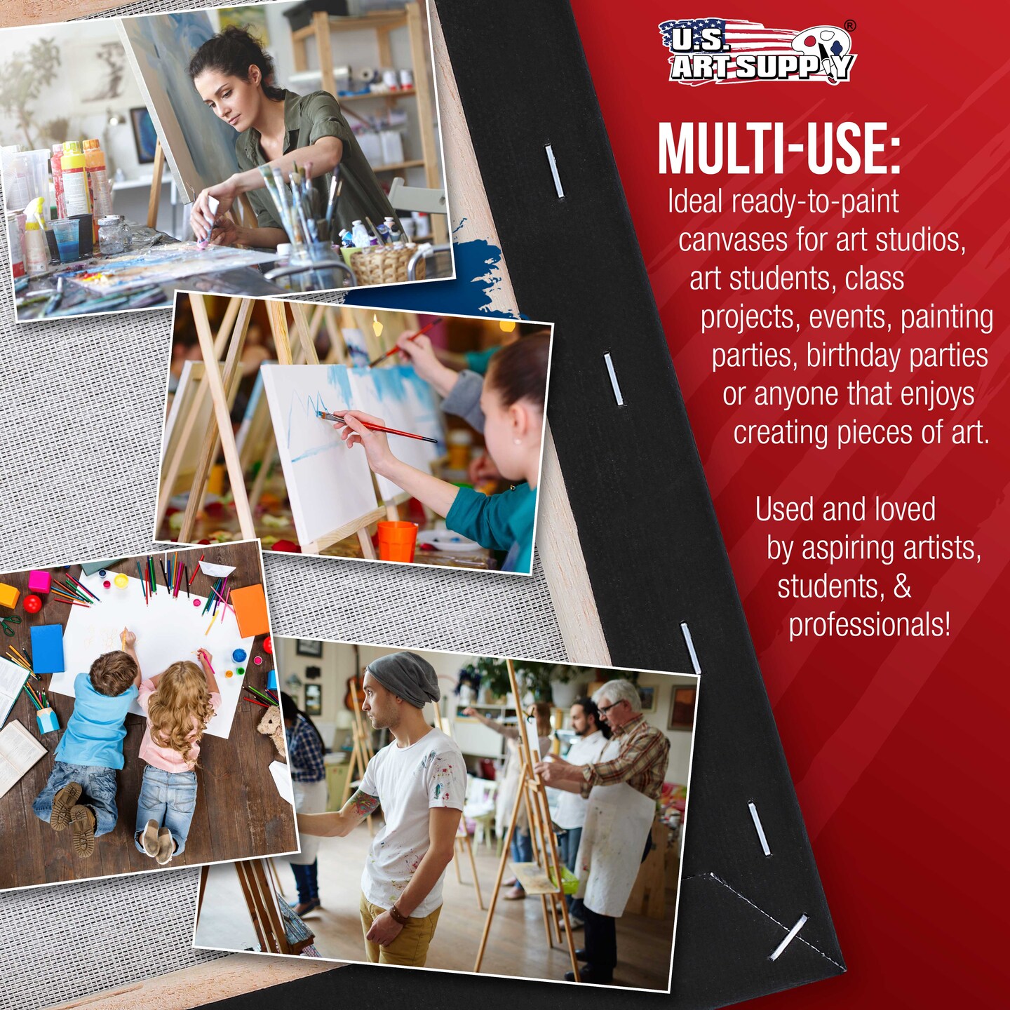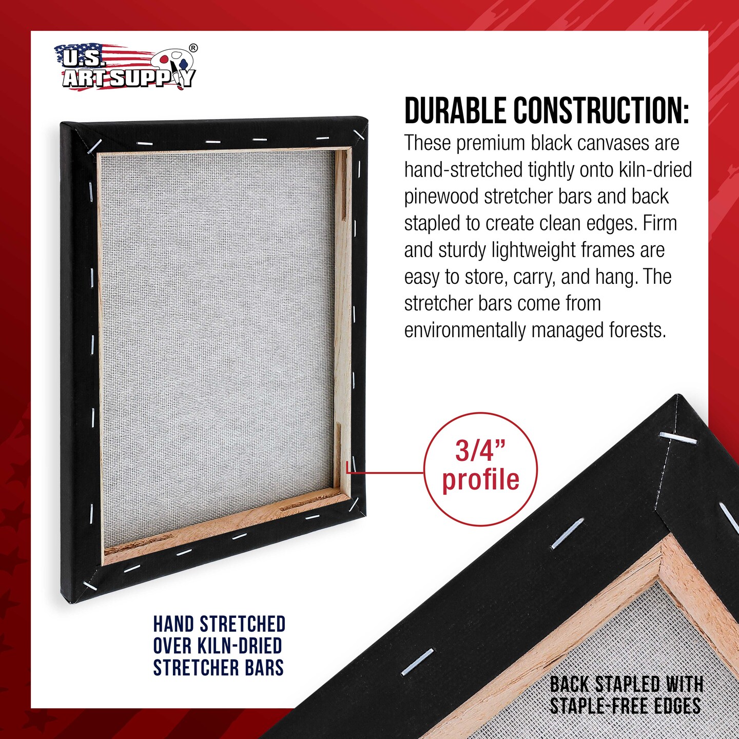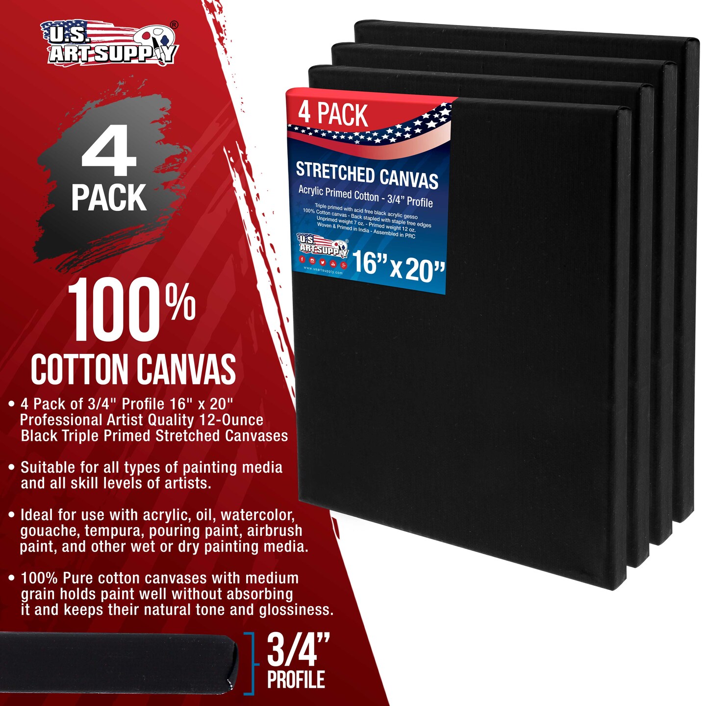 16 x 20 inch Black Stretched Canvas 12-Ounce Primed, 4-Pack - Professional Artist Quality 3/4" Profile, 100% Cotton, Heavy-Weight, Gesso